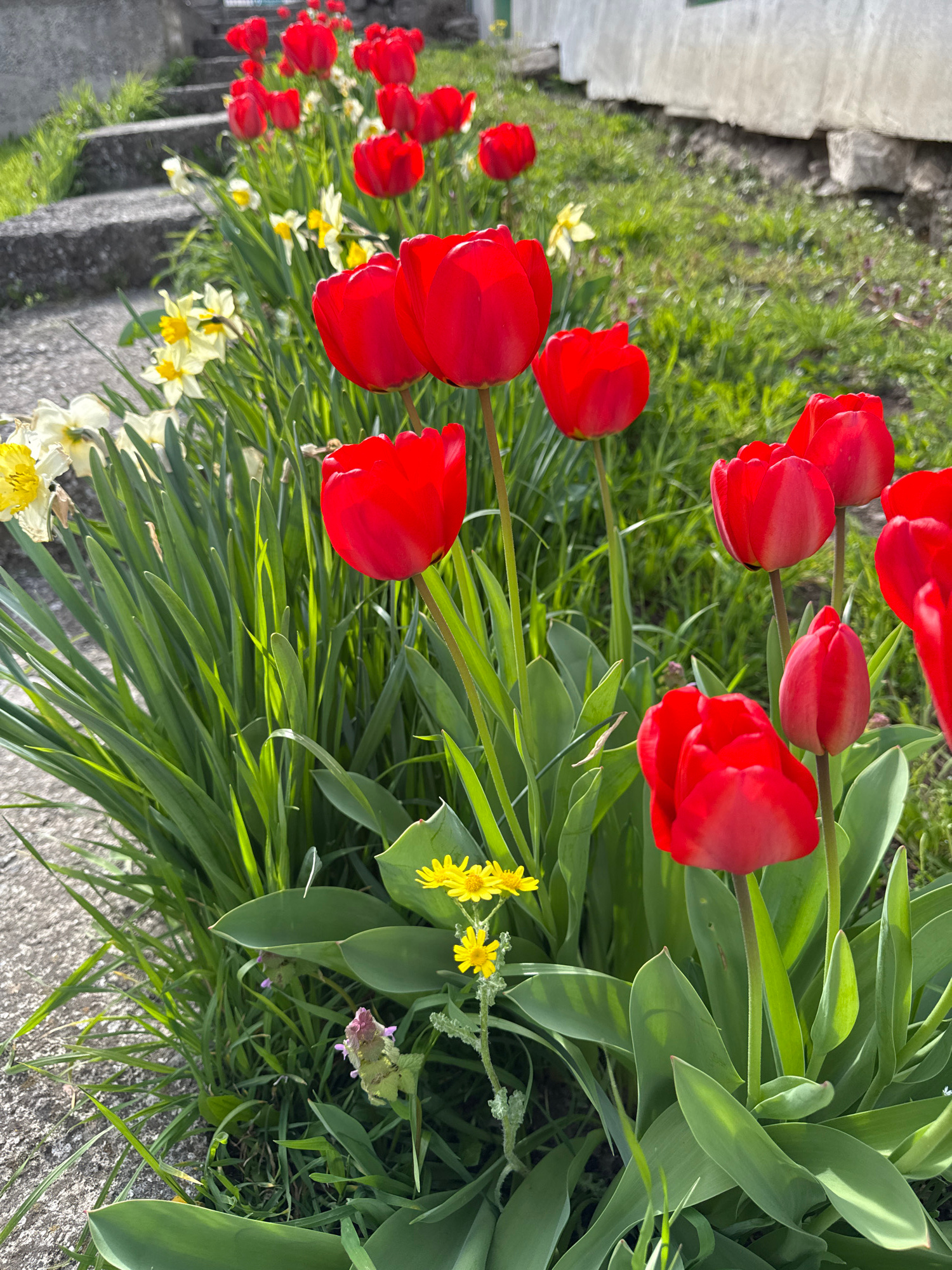 The image shows a close-up of a garden bed with red tulips, daffodils, and other green plants. The flowers are brightly colored, and the greenery appears lush. The edge of a concrete path or structure…read more