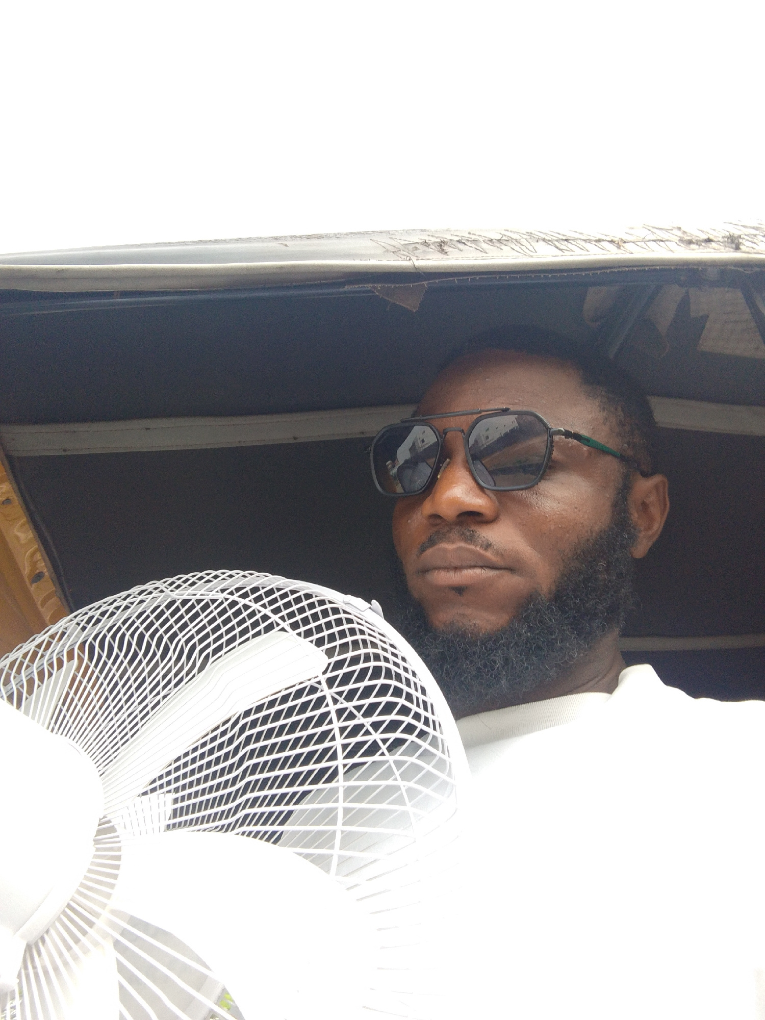 A medium-shot image captures a man with a dark complexion, a full beard, and sunglasses, holding a white electric fan. He is positioned within a three-wheeled vehicle (keke or auto-rickshaw) as the ce…read more