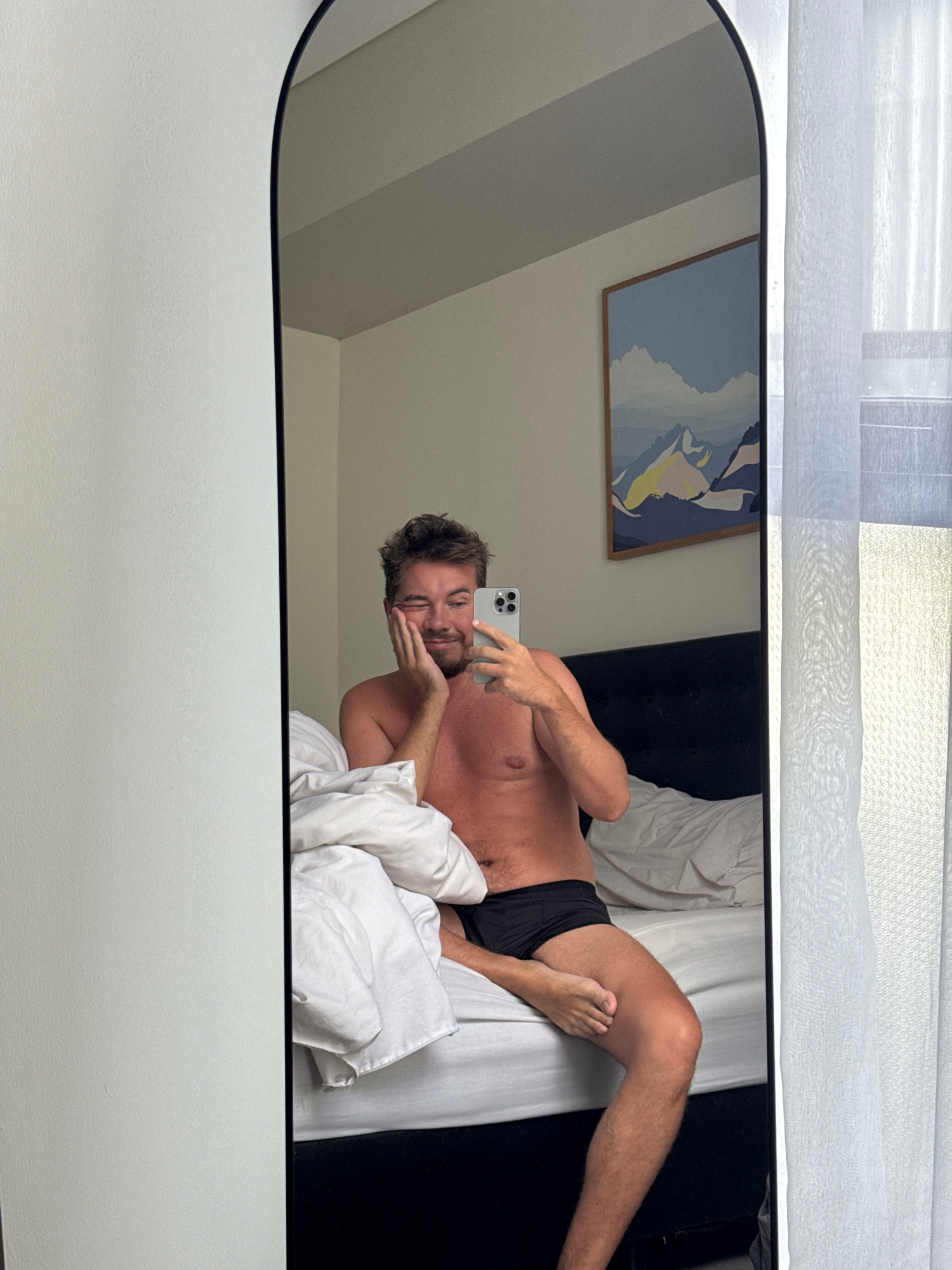 A mirror on a white wall reflects a man in black boxer shorts lying on a white-sheeted bed. He is holding a smartphone and posing with his hand on his cheek. A framed painting hangs on the wall behind…read more