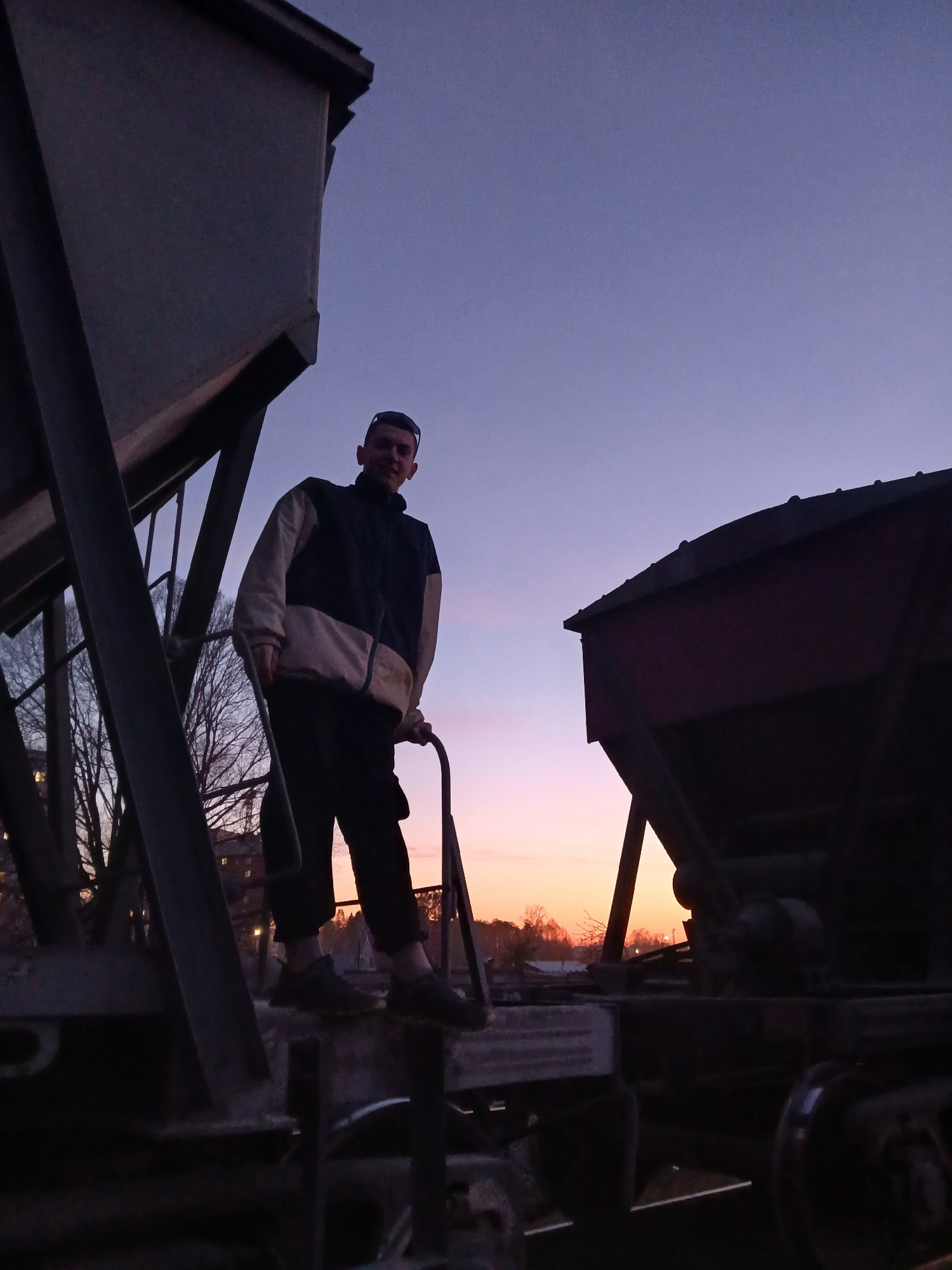The image depicts a young man standing on a large metallic structure during dusk or twilight. The photograph is oriented sideways, with the sky appearing on the left and right, but when viewed upright…read more