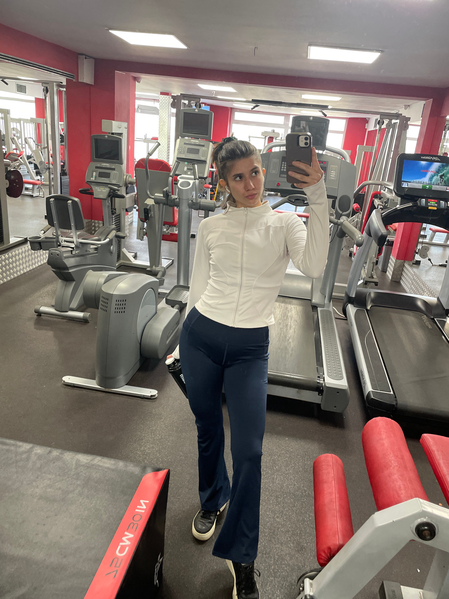 The image is taken at a gym in Sofia, Bulgaria, indicated by the Cyrillic writing on the equipment in the foreground. A woman in workout attire, consisting of a white zip-up jacket and dark blue pants…read more
