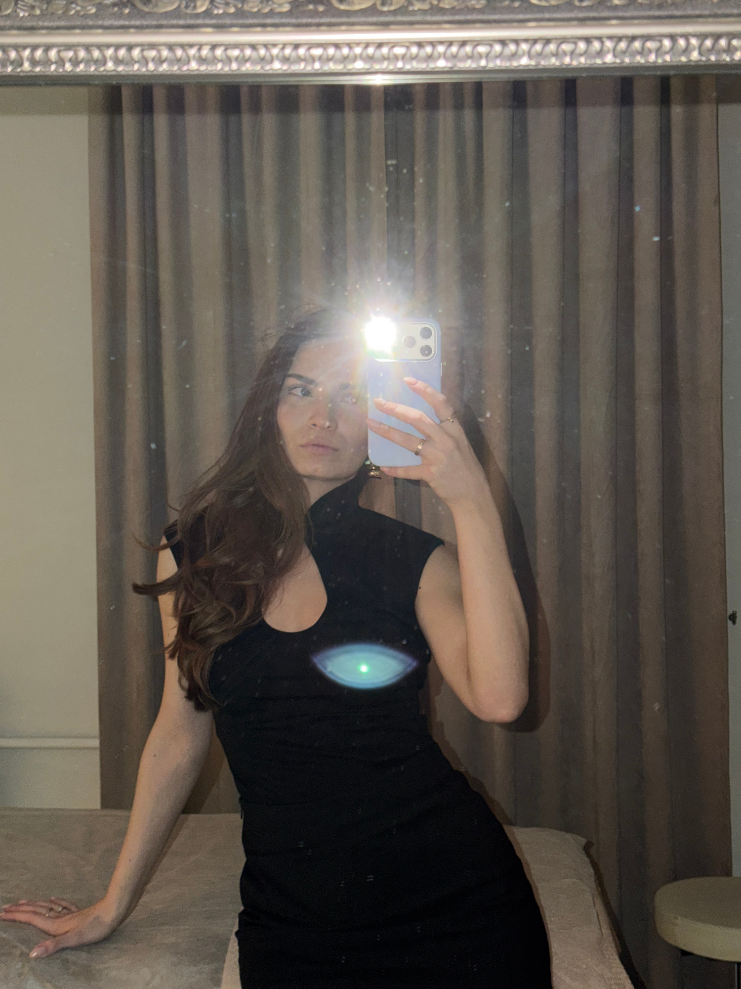 The image displays a young woman taking a selfie in a mirror, with the photo originally captured in portrait orientation but presented here rotated 90 degrees counter-clockwise. She holds a light-colo…read more