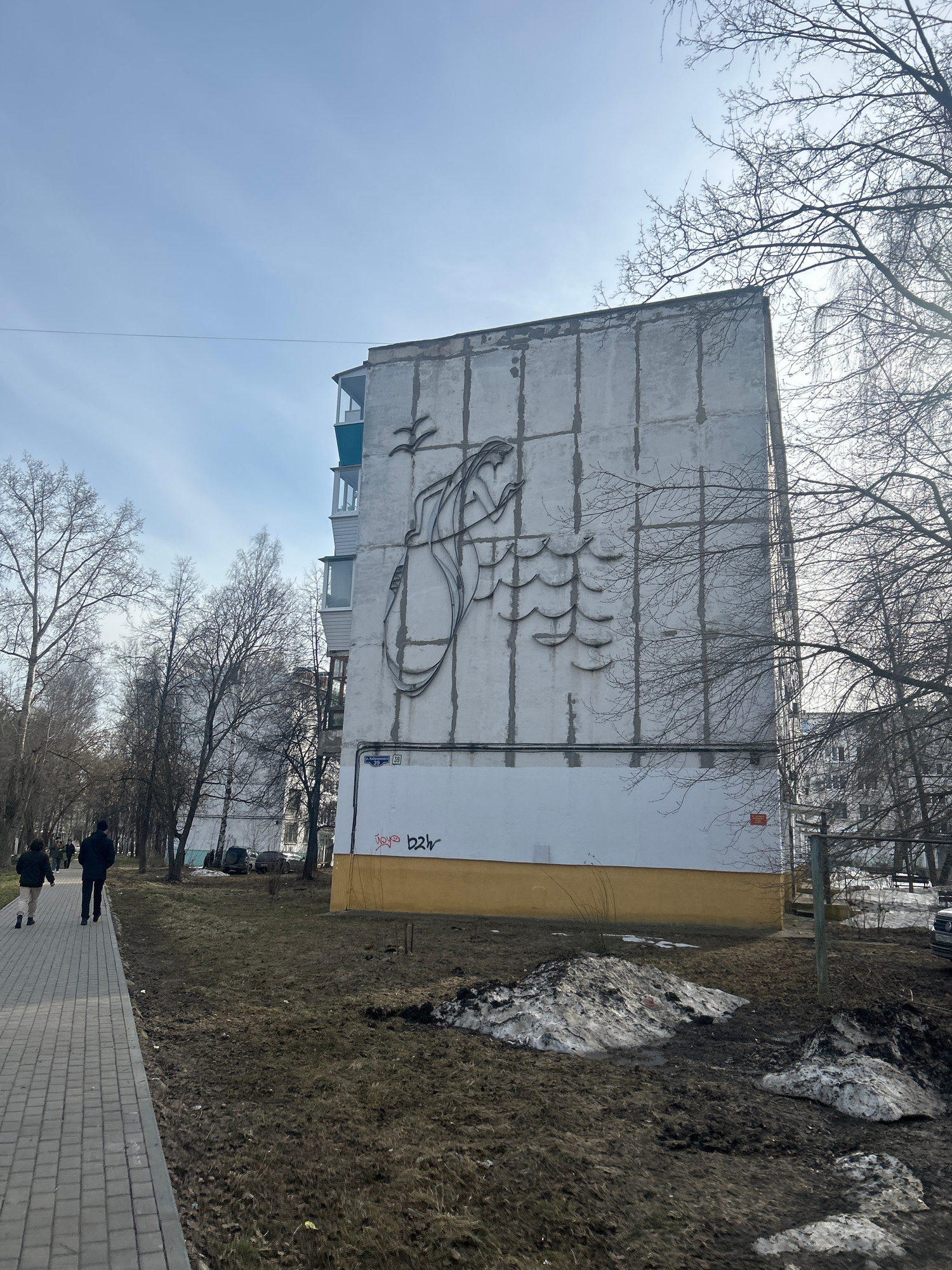 The image shows a five-story building in Chaikovsky, Russia, with a large abstract mural on its side, featuring a stylized image in black lines. The building appears to be made of concrete panels. The…read more
