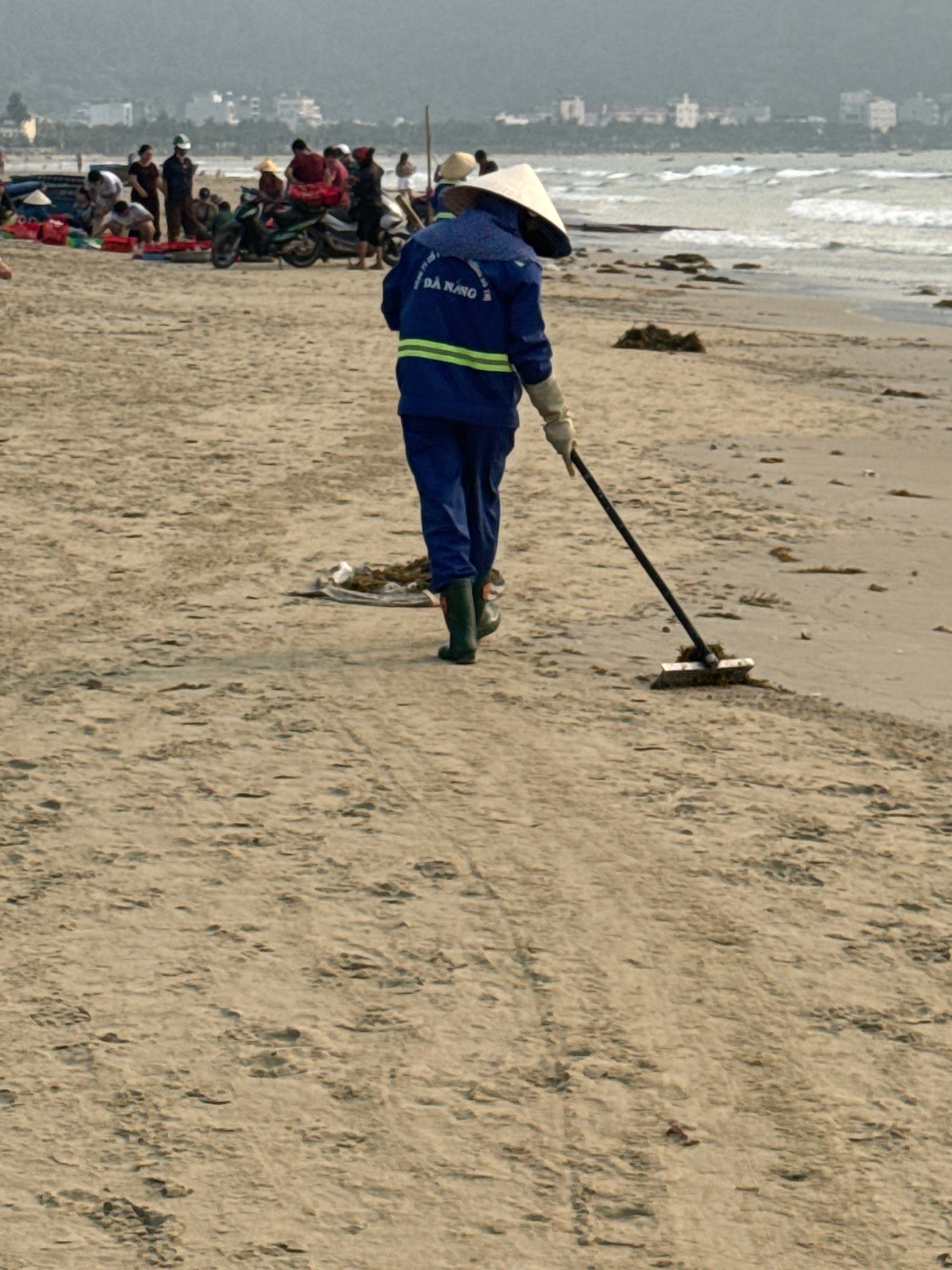 A beach scene in Đà Nẵng, Vietnam. A person wearing a conical hat, blue uniform with green stripes, and rubber boots is cleaning the sand with a long-handled tool. A group of people and parked scooter…read more