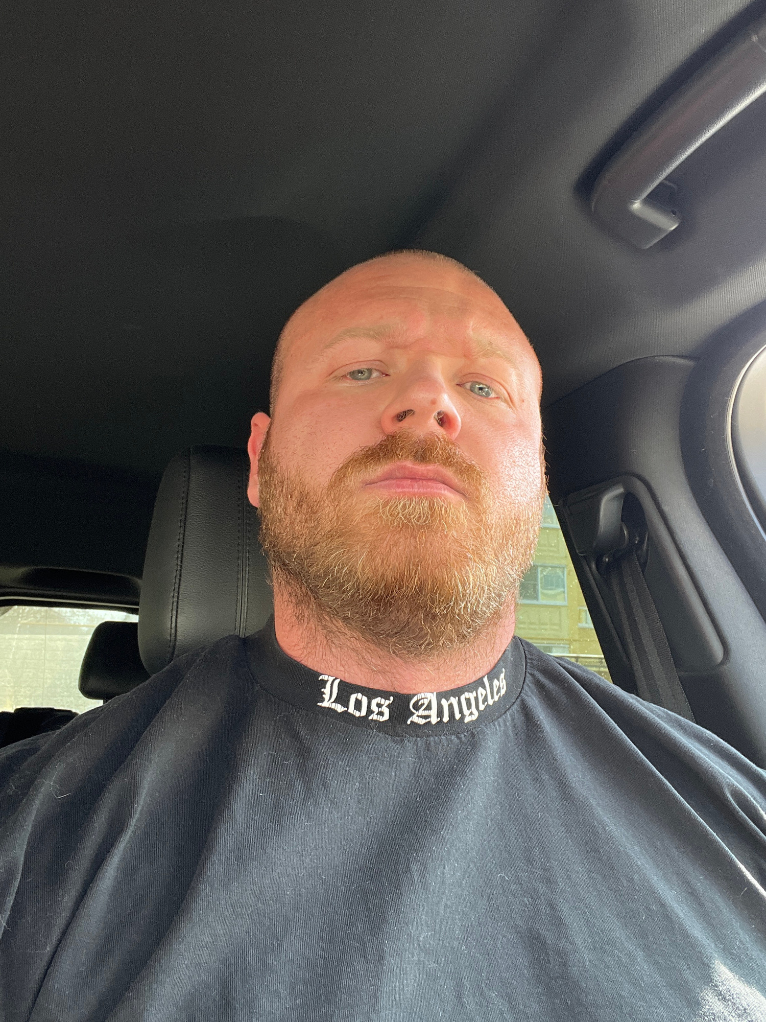 A man with fair skin, a bald head, a ginger beard and blue eyes is seated in the driver's seat of a car. He is wearing a black t-shirt that reads "Los Angeles" in a white gothic font. The interior ofโฆread more