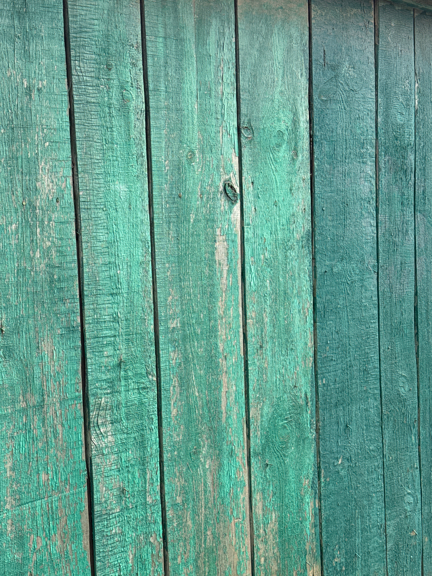 The image shows a weathered wooden surface, likely a floor or wall, consisting of horizontally aligned planks. The wood is painted in a faded teal or turquoise color, with significant paint peeling an…read more