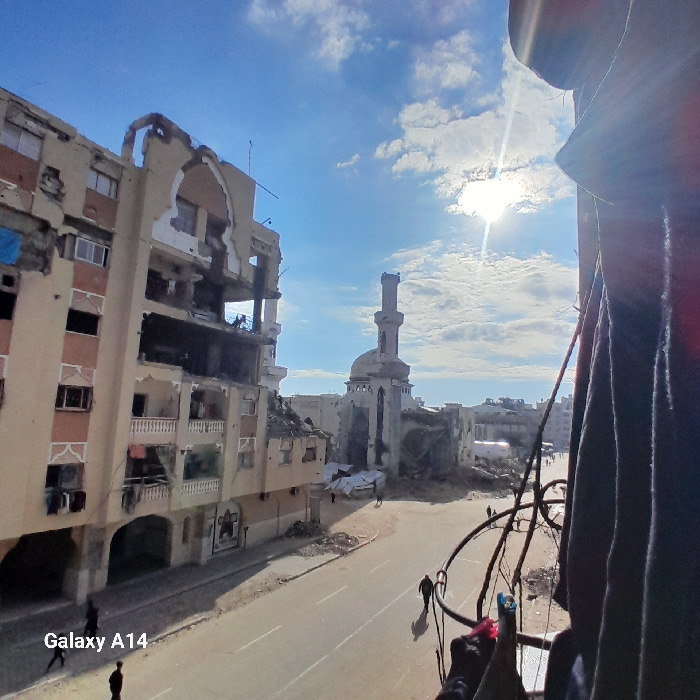 The image shows extensive destruction of buildings, including an apartment complex with significant structural damage and missing walls. A mosque with a minaret is visible amidst the wreckage. Debris…read more