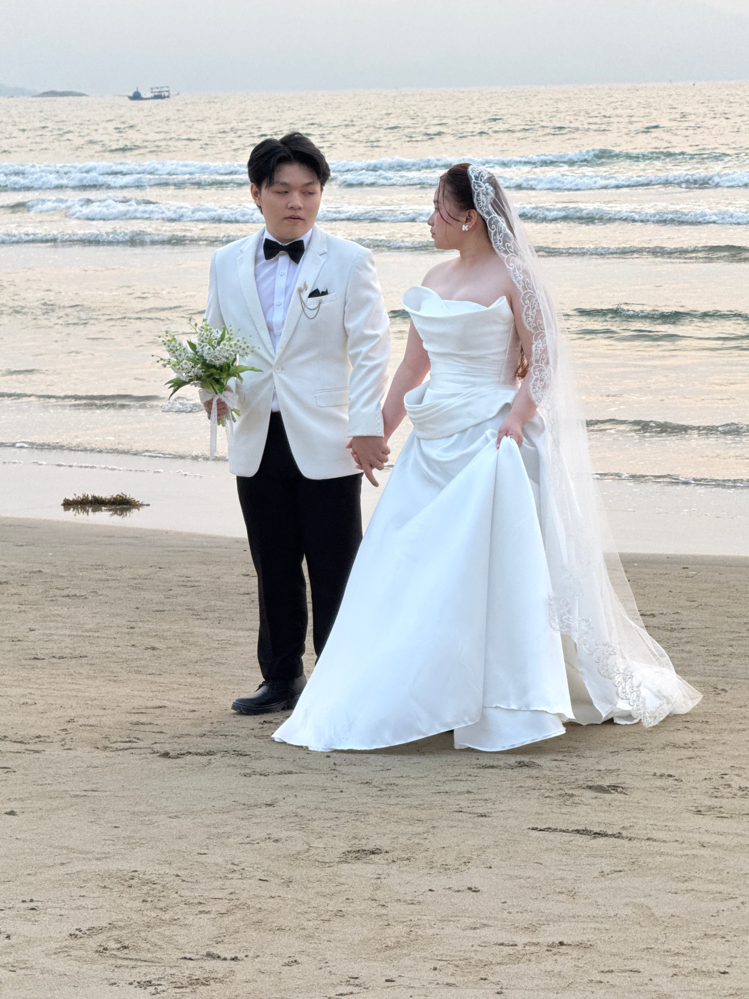 A wedding photo captures a couple on a beach in Đà Nẵng, Vietnam. The bride wears a white, off-the-shoulder gown and a lace-trimmed veil. She's holding up the front of her dress. The groom is in a whi…read more