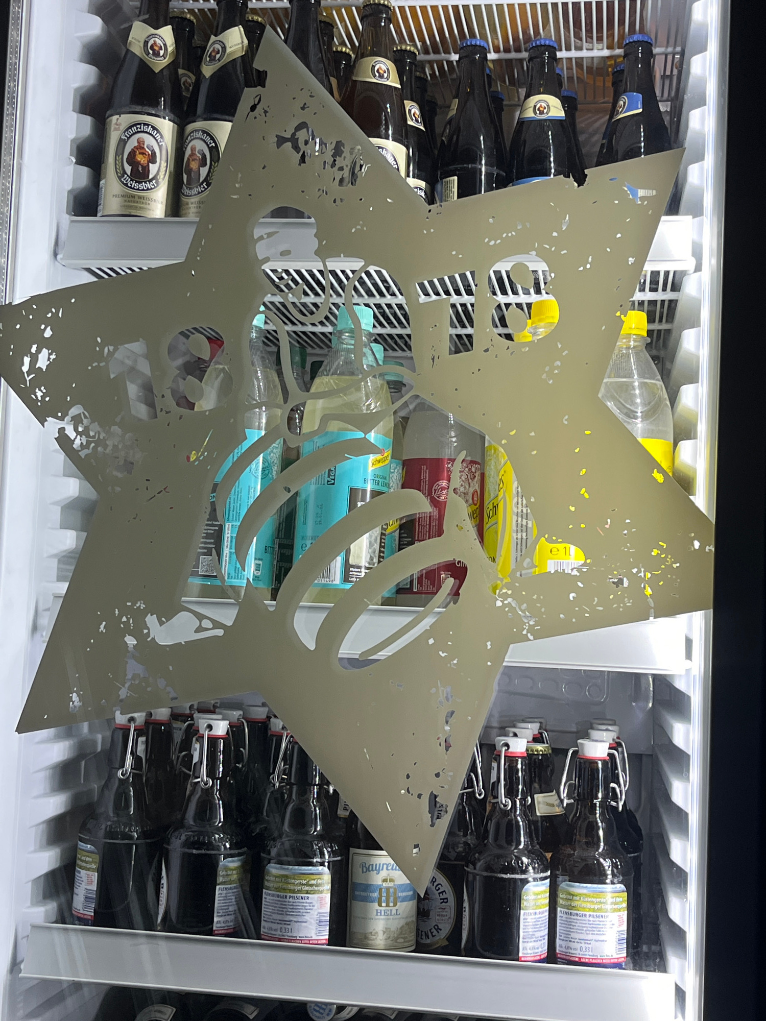 The image shows the inside of a refrigerator, possibly in a retail setting like a convenience store or bar, in Saarbrücken, Germany. The shelves are stocked with various beverages, primarily bottled b…read more