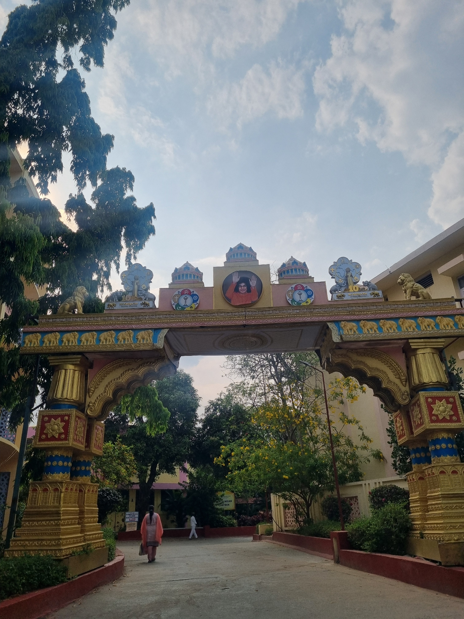 The image shows an ornate archway in Puttaparthi, India. The archway is decorated with religious symbols, elephants, lions, and a portrait of Sathya Sai Baba. The archway leads into a garden or park a…read more