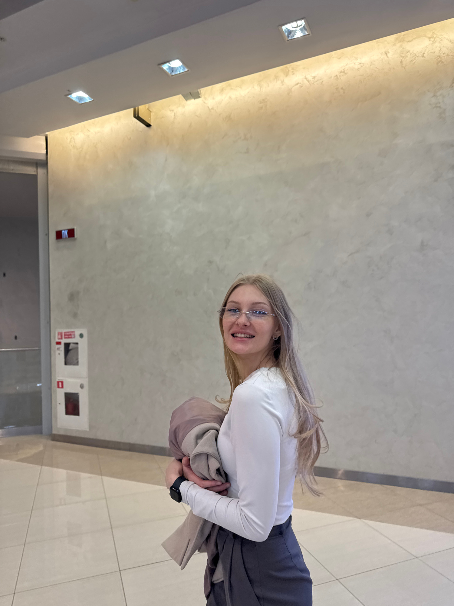 A young woman with long blonde hair, wearing glasses, a white long-sleeved shirt, and gray trousers, stands in what appears to be an interior space with a light-colored, textured wall and tiled floor.…read more