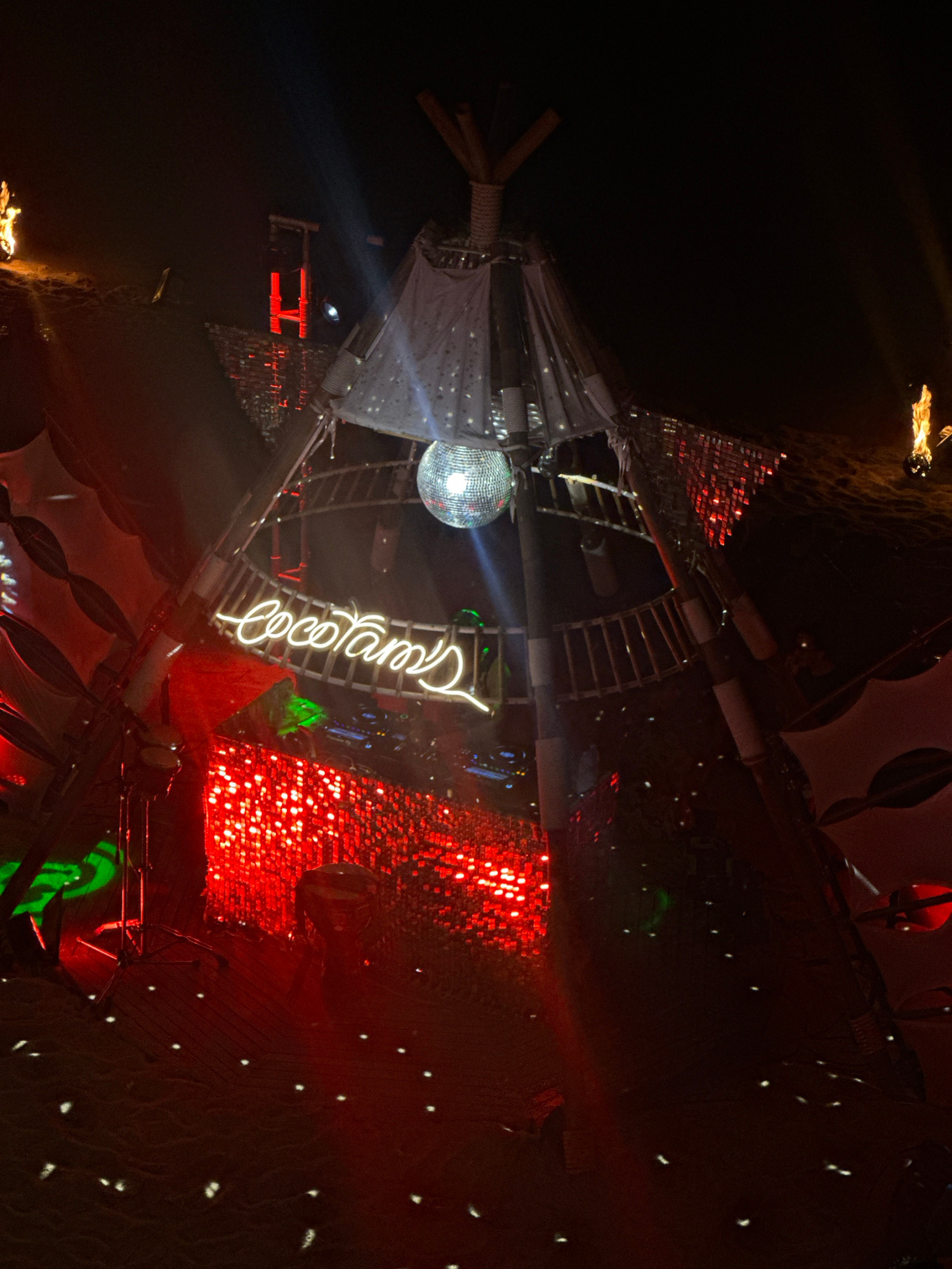 This nighttime image captures a vibrant, illuminated outdoor venue, likely a bar or entertainment spot, at Baan Bo Phut, Thailand. The central focus is a multi-tiered structure, possibly a large stage…read more