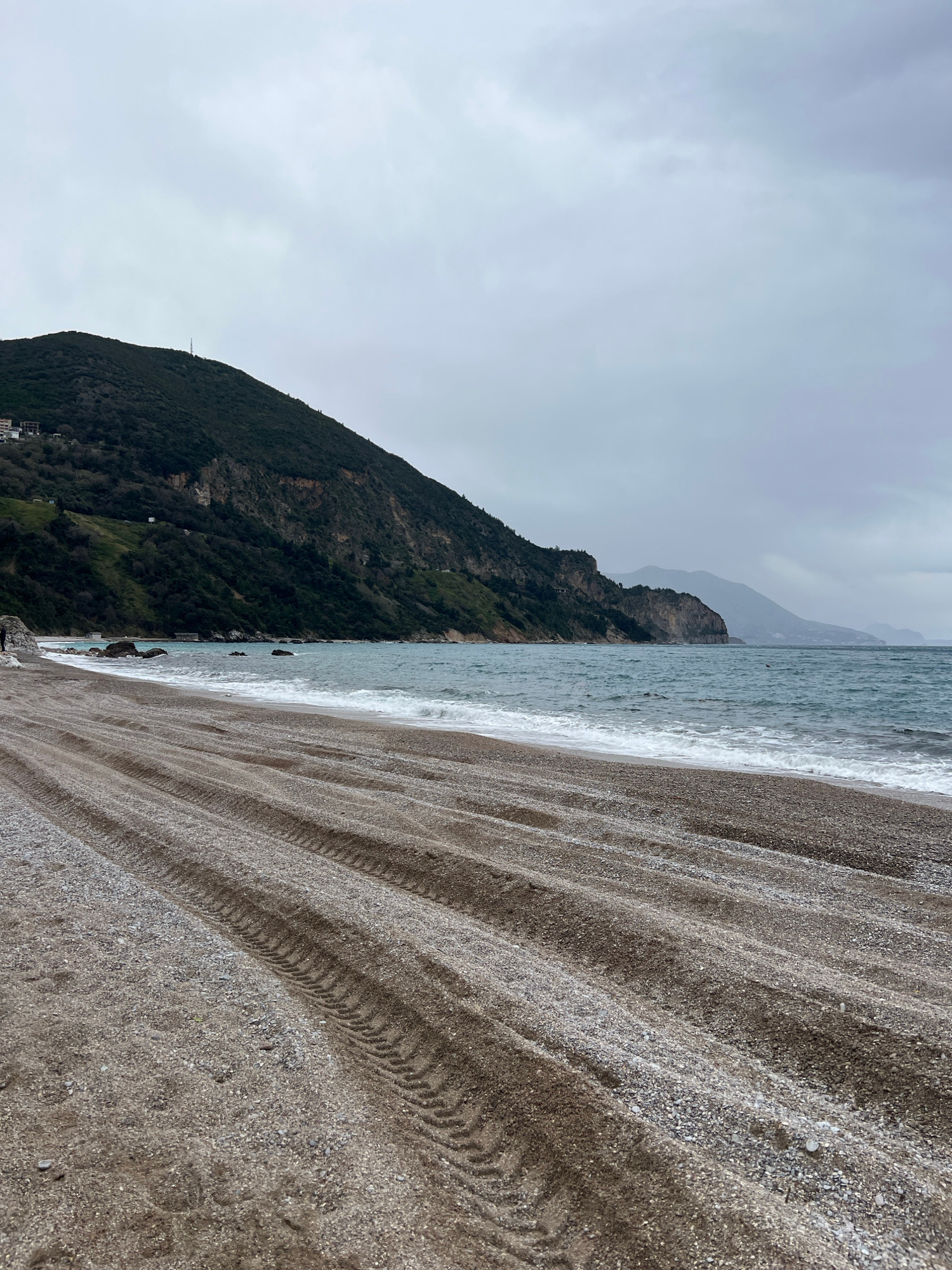 The image depicts a beach scene in Prijevor, Montenegro. The beach is composed of coarse, dark sand and small pebbles, marked by numerous tire tracks running parallel to the shoreline. The sea is a li…read more