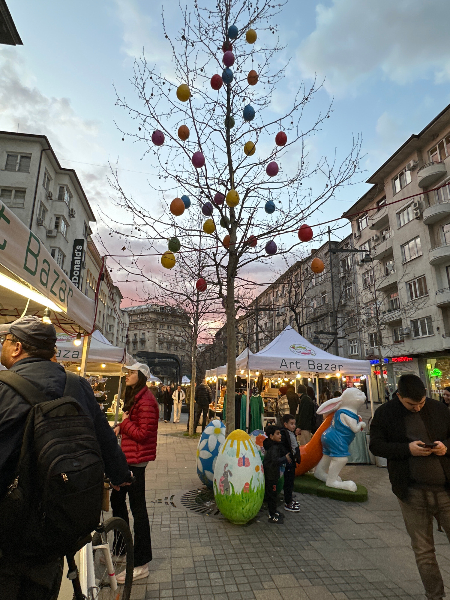 This image captures a street scene in Sofia, Bulgaria, likely during an Easter celebration. A pedestrianized area is lined with market stalls under the "Art Bazar" banner, while a "McDonald's" sign is…read more
