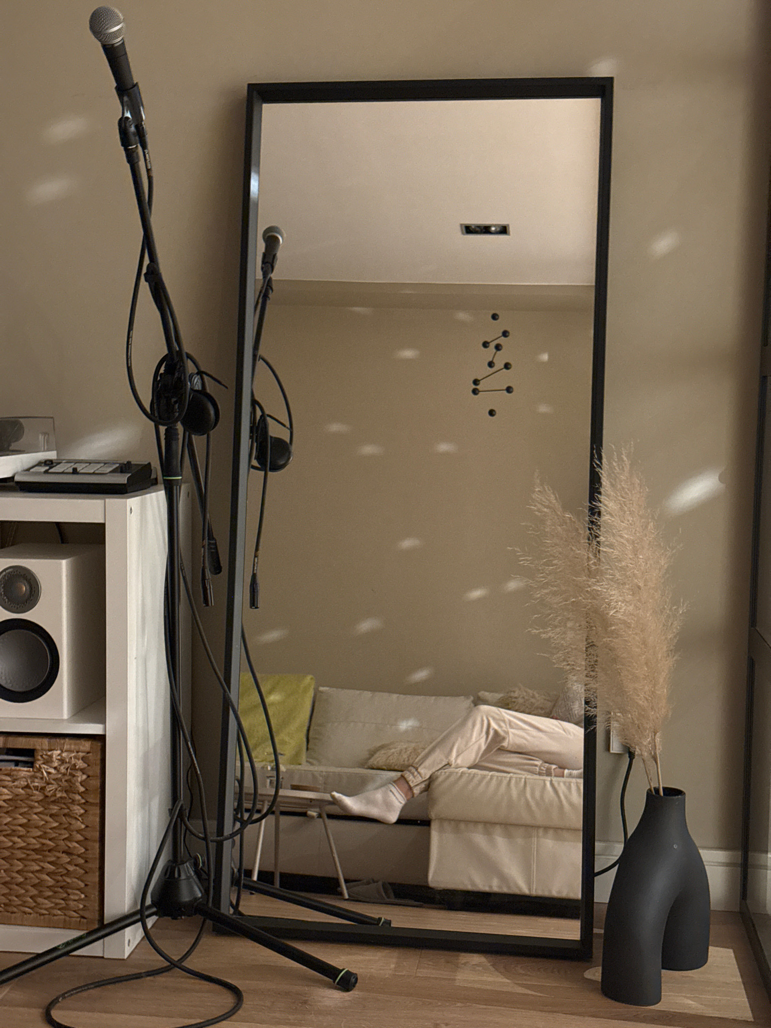 A horizontally oriented image shows a room with a large rectangular mirror in a black frame mounted on a wall. The mirror reflects part of the room, including a person sitting on a chair, visible in t…read more
