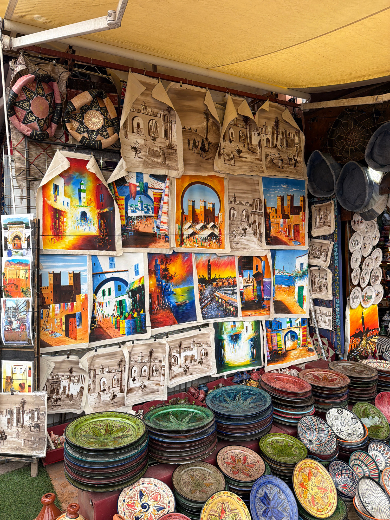 An overhead shot captures a market stall in Marrakesh, Morocco, showcasing various artisanal crafts. The display primarily features stacks of hand-painted plates with intricate designs and a collectio…read more