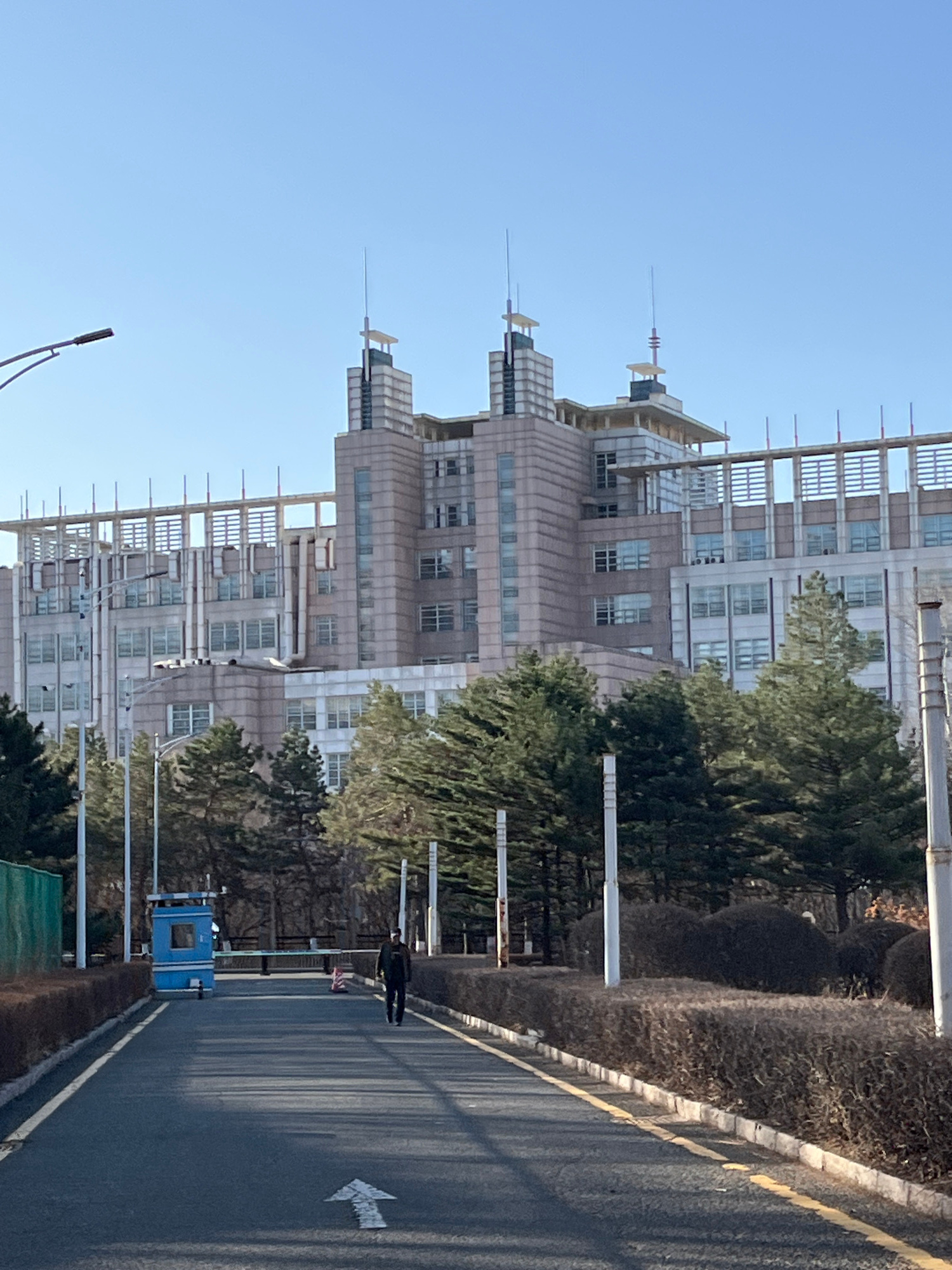 The image shows a scene in Changchun City, China, featuring a modern, multi-story building with a distinct architectural style. The building is light-colored with numerous windows and decorative eleme…read more