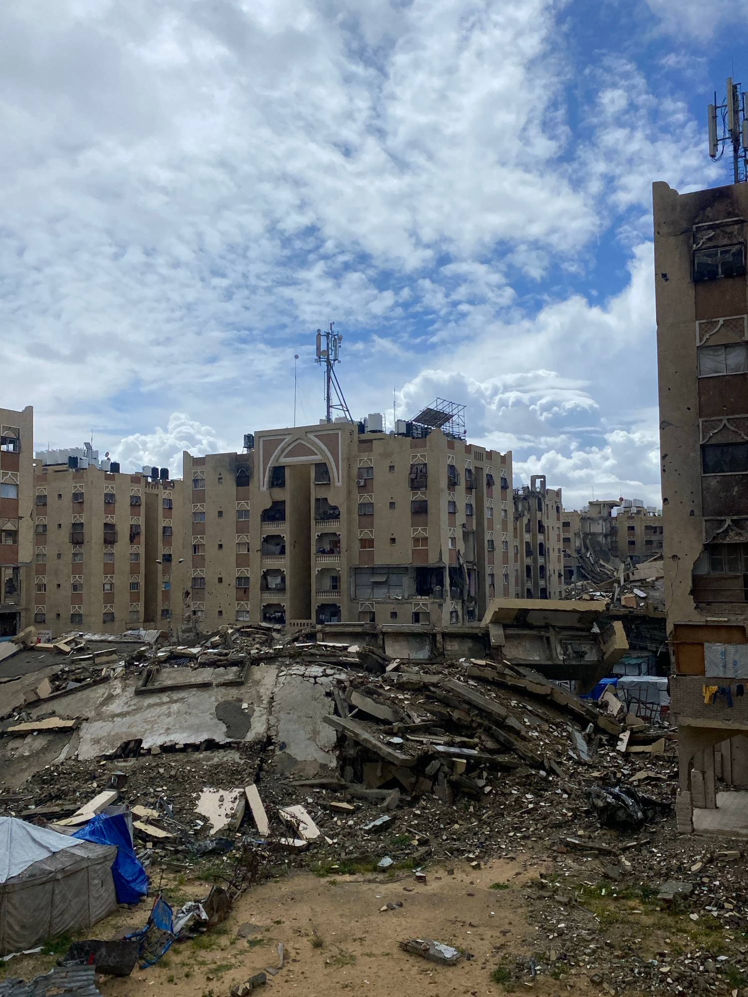 The image depicts a devastated urban landscape in Khan Yunis, Palestinian Territory, under a sky with scattered white cumulus clouds. The foreground shows a sandy-brown terrain interspersed with rubble and debris. In the lower-left, a light-colored tent is partially covered by a blue tarp, with additional blue fabric nearby. The midground is dominated by a massive mound of collapsed concrete and rebar, indicating a completely destroyed structure. To the right, the lower section of a building exhibits heavy damage, with yellow fabric hanging from its exterior. In the background, a series of multi-story apartment buildings, approximately eight to ten floors tall, line the horizon. These structures show extensive damage, including numerous shattered windows, exposed darkened interiors, and widespread impact marks on their facades. Several buildings display charred sections, indicating fire damage. Black water tanks are visible on many rooftops. A prominent building in the center features a decorative arched element on an upper floor, also showing signs of damage. Cellular communication towers with multiple antennae are mounted on the rooftops of two buildings, one centrally located and another on the far right. The building on the far right edge of the frame is heavily damaged, with visible rebar and broken window frames, and its facade displays multiple perforations consistent with bullet or shrapnel impact. No individuals are visible in the scene. | Open Wire