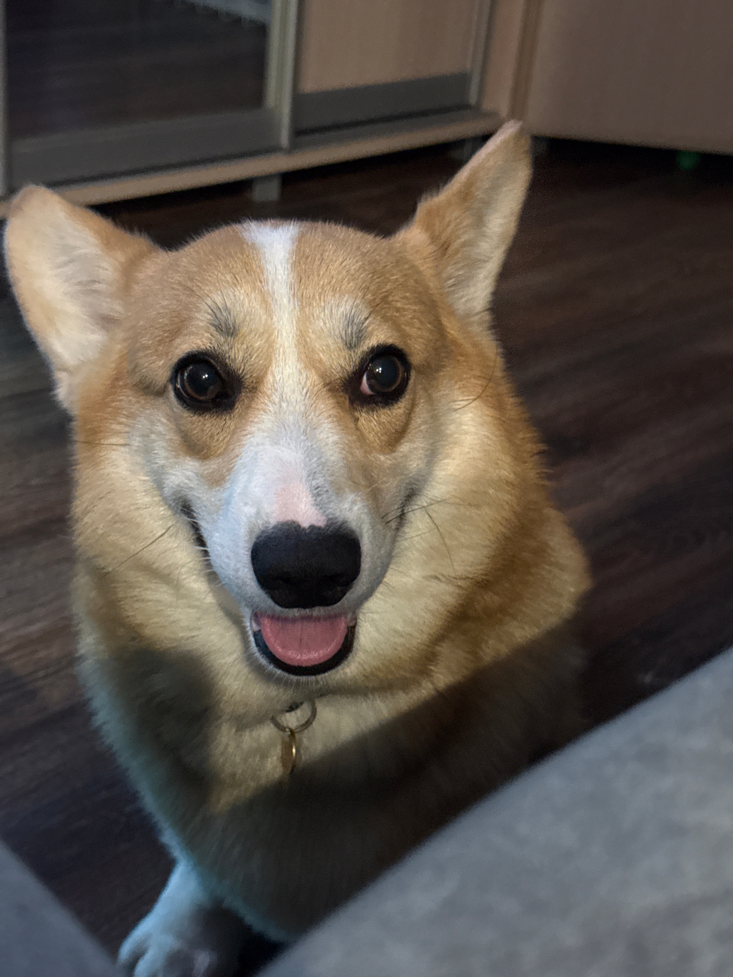 A close-up, high-angle shot shows a tan and white corgi dog looking directly at the camera with its head tilted. The dog's tongue is slightly visible. The background includes a dark wood-like floor an…read more