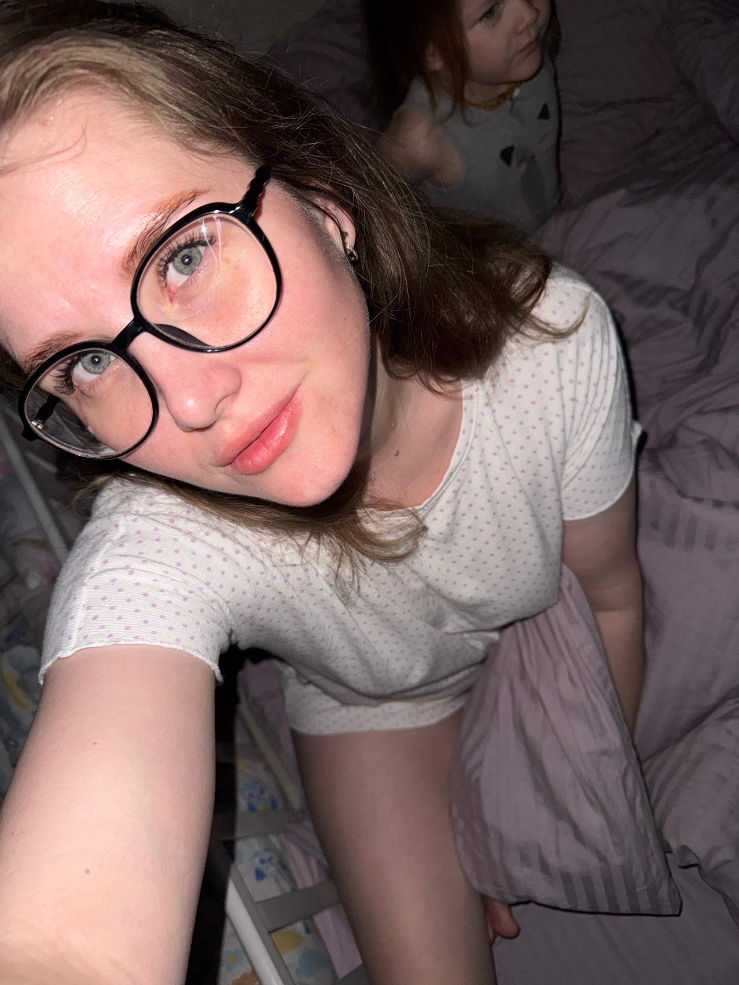A woman wearing black-rimmed glasses and a white shirt with lavender polka dots is lying on her back in a bed with a light purple comforter. She is looking directly at the camera with her head tilted…read more