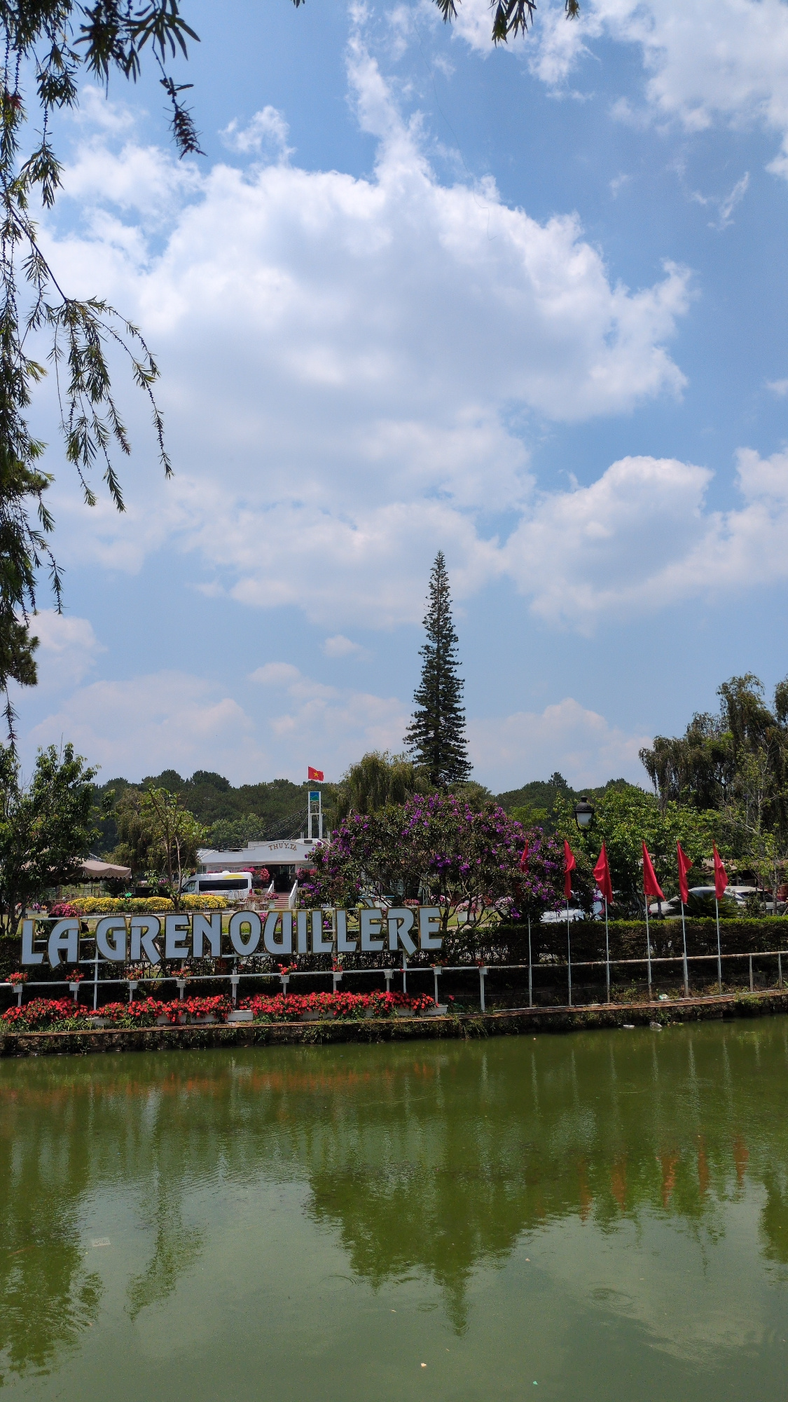 The image shows the "La Grenouillère" sign next to a body of water, possibly a lake or pond, under a bright blue sky with scattered clouds. The sign, with its letters running vertically in the image,…read more