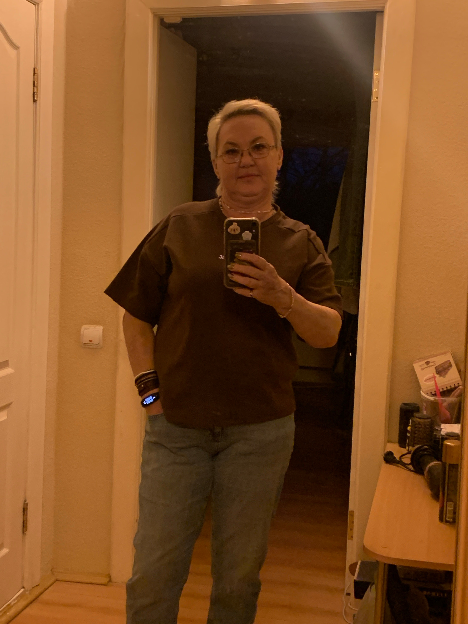 The image shows a woman in a mirror selfie. She has short white hair, glasses, and is wearing a brown shirt and blue jeans. She is holding a cell phone in her right hand. She is wearing a watch and a…read more