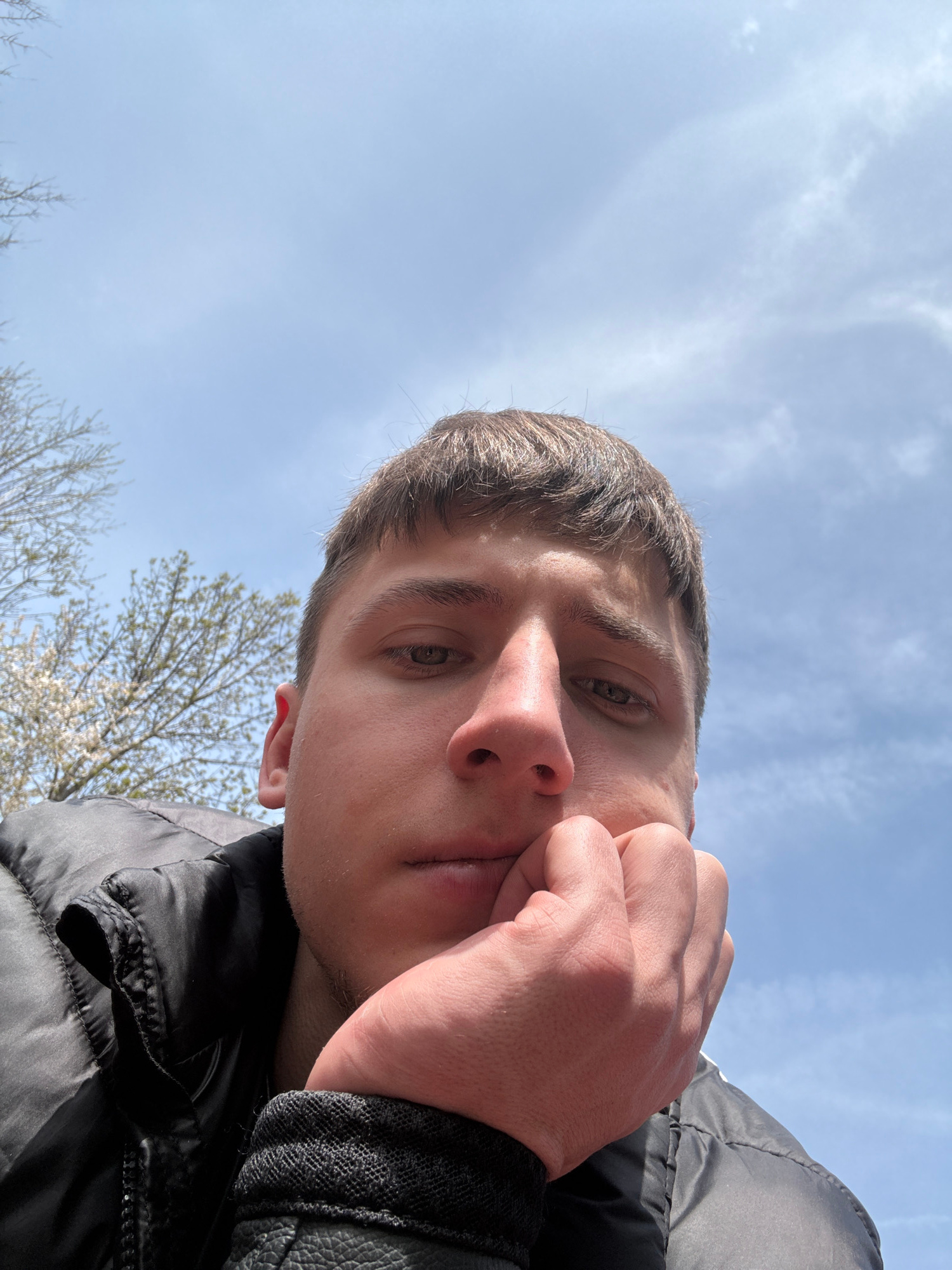 A low-angle close-up shot shows a young man with short brown hair, fair skin, and visible stubble. He is wearing a black puffy jacket. His right hand is near his face, fingers slightly curled. The bac…read more