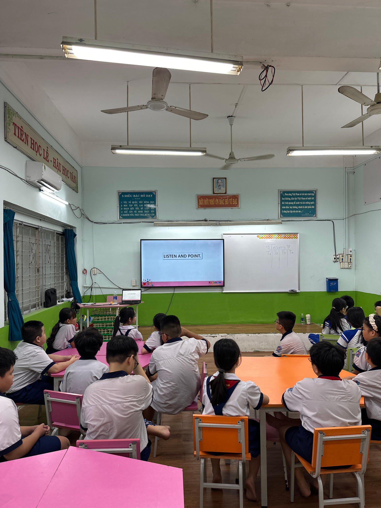 The image depicts a classroom in Ho Chi Minh City, Vietnam, where students wearing white shirts and dark blue shorts are sitting at tables facing a screen displaying the words "LISTEN AND POINT." The…read more