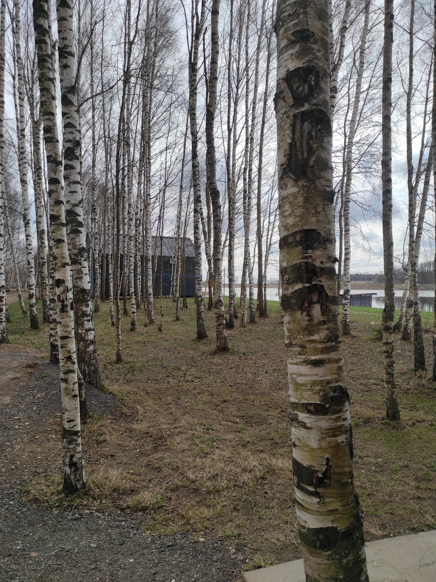 The image shows a row of birch trees in Borshchevo, Russia. The trees are lined up in rows, with a building visible in the background between the trunks. The ground is covered with dry grass and grave…read more