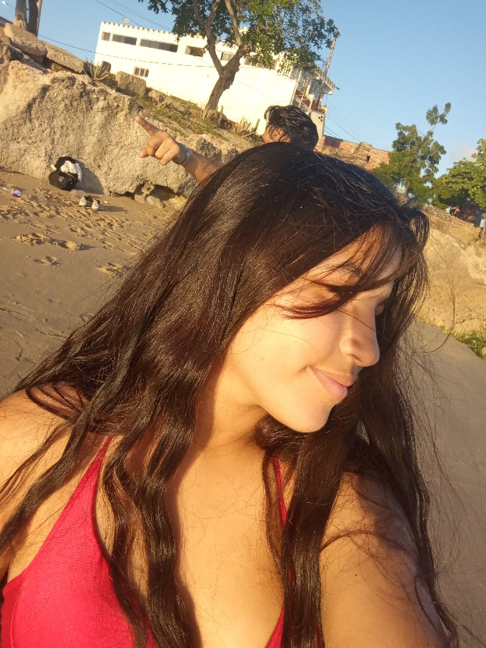 A young woman with long, dark hair stands in the foreground, wearing a red top. Her face is in profile, angled slightly downward. Behind her, a person points toward a white building perched atop a roc…read more