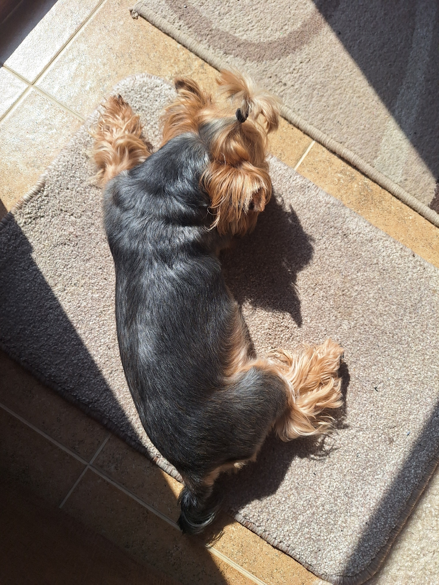 An overhead view captures a small dog, likely a Yorkshire Terrier, resting on a light-colored, shaggy rug. The dog's fur is a distinct two-tone: glossy dark grey or black along its back and body, tran…read more