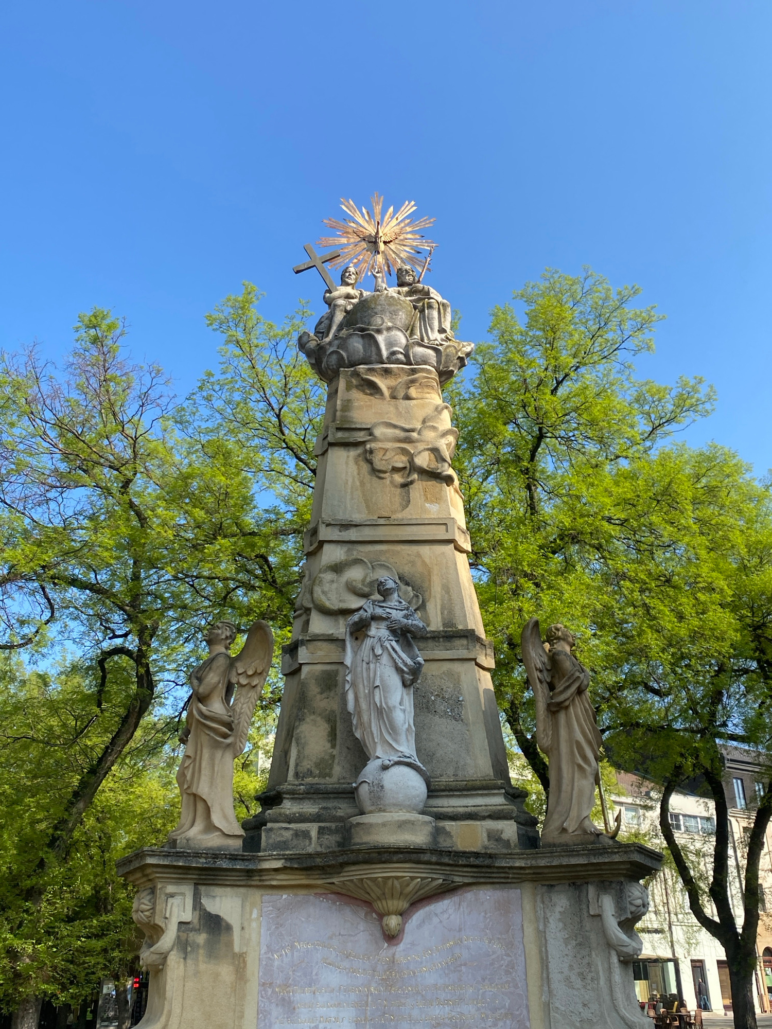 This image captures a tall, ornate stone monument, likely a religious column such as a Holy Trinity or Marian column, set against a bright blue sky. The monument is intricately sculpted from light-col…read more