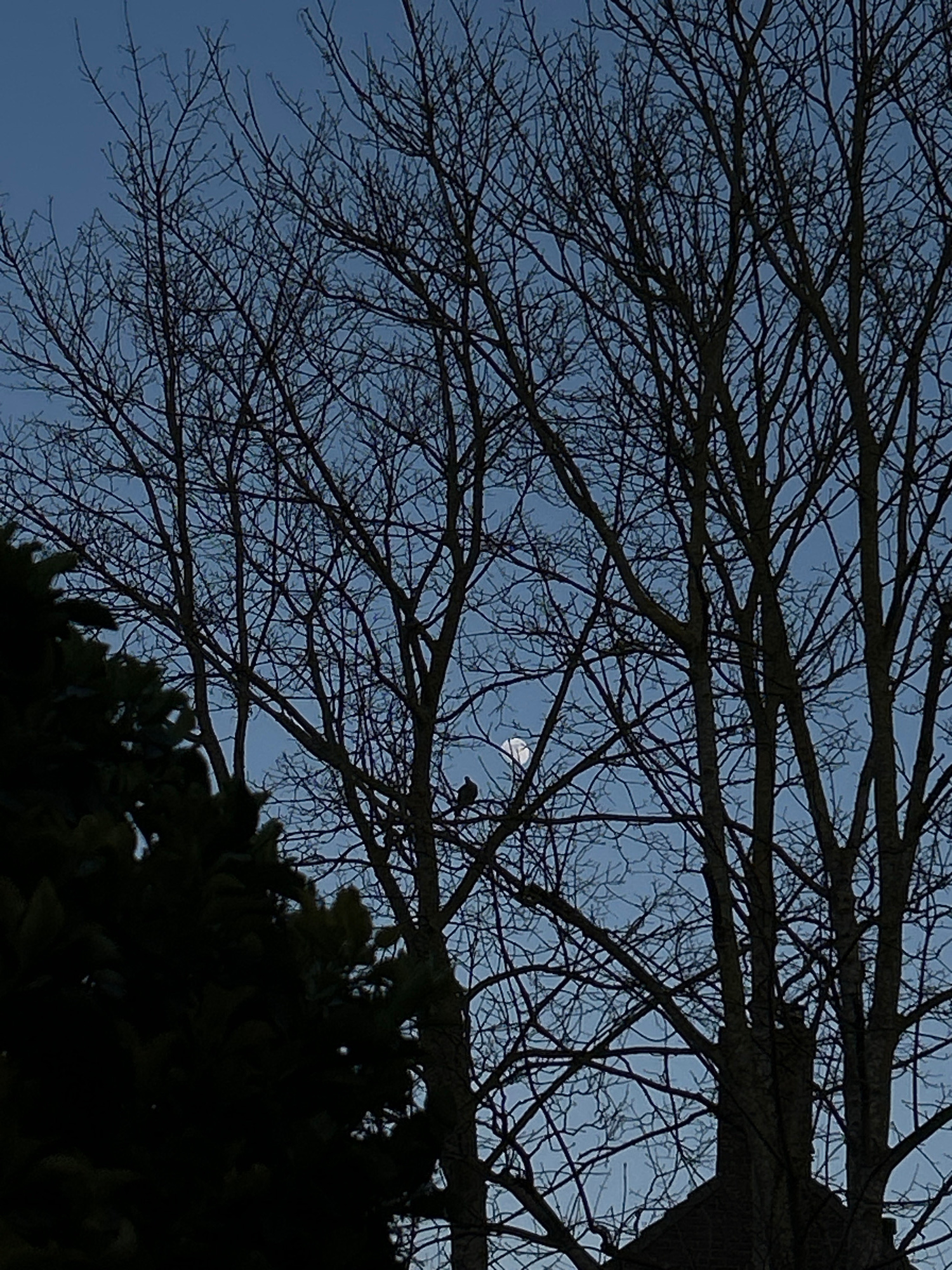 The image shows a view looking upwards through bare tree branches against a blue sky. A partial moon is visible among the branches. A darker green shrub or tree is present in the lower right corner, p…read more