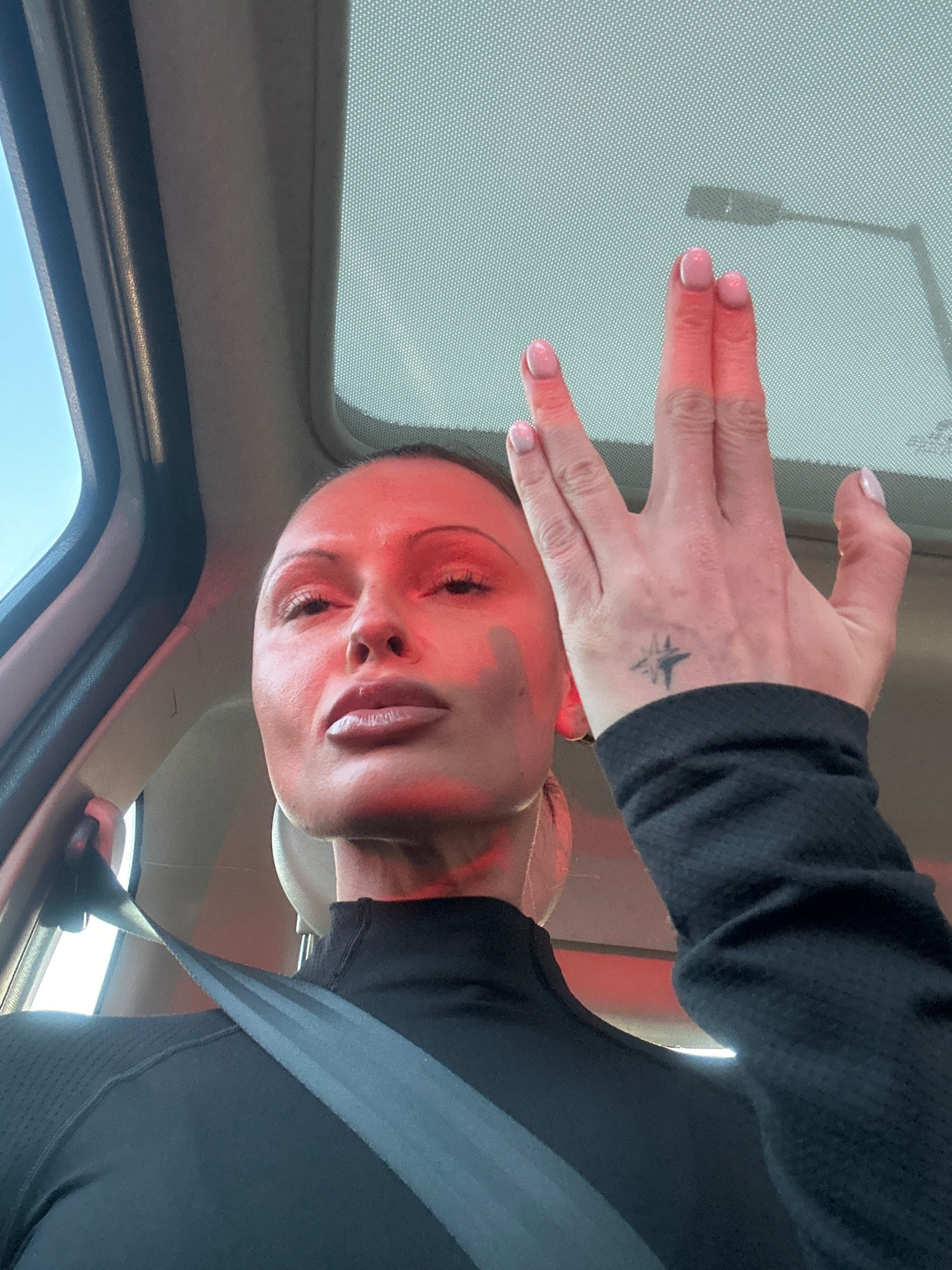 A female individual is depicted within the interior of a vehicle, positioned as a passenger. Her face, characterized by light skin, prominent cheekbones, and glossy lips, is strongly illuminated by a…read more