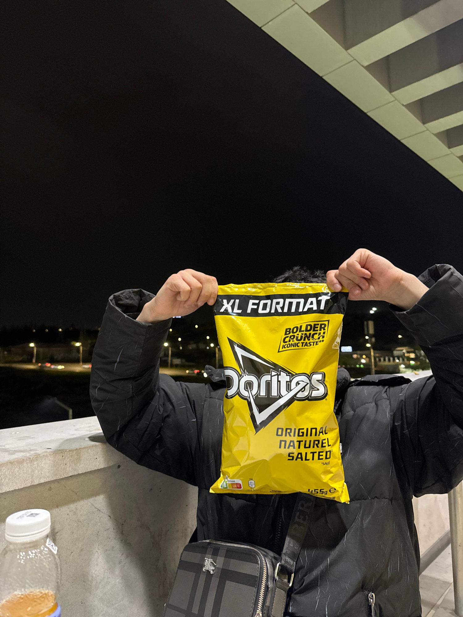 A person wearing a black puffer jacket holds a bag of Doritos chips in front of their face at night. The chips are "XL Format" and "Original Naturel Salted". The person stands next to a concrete ledge…read more
