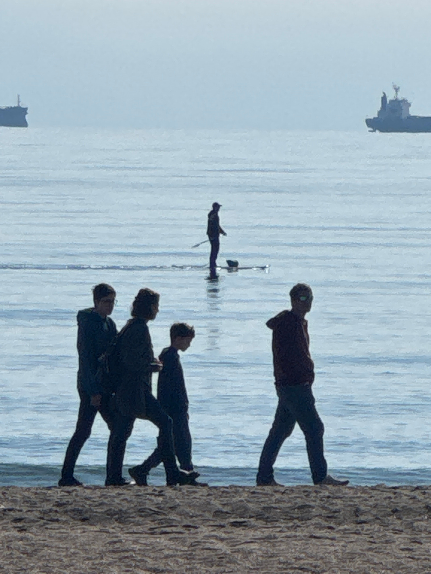 The image depicts a group of people at Burgas beach in Burgas, Bulgaria. The group consists of four people standing on a paved surface to the right of the frame. Adjacent to them is water, in which a…read more