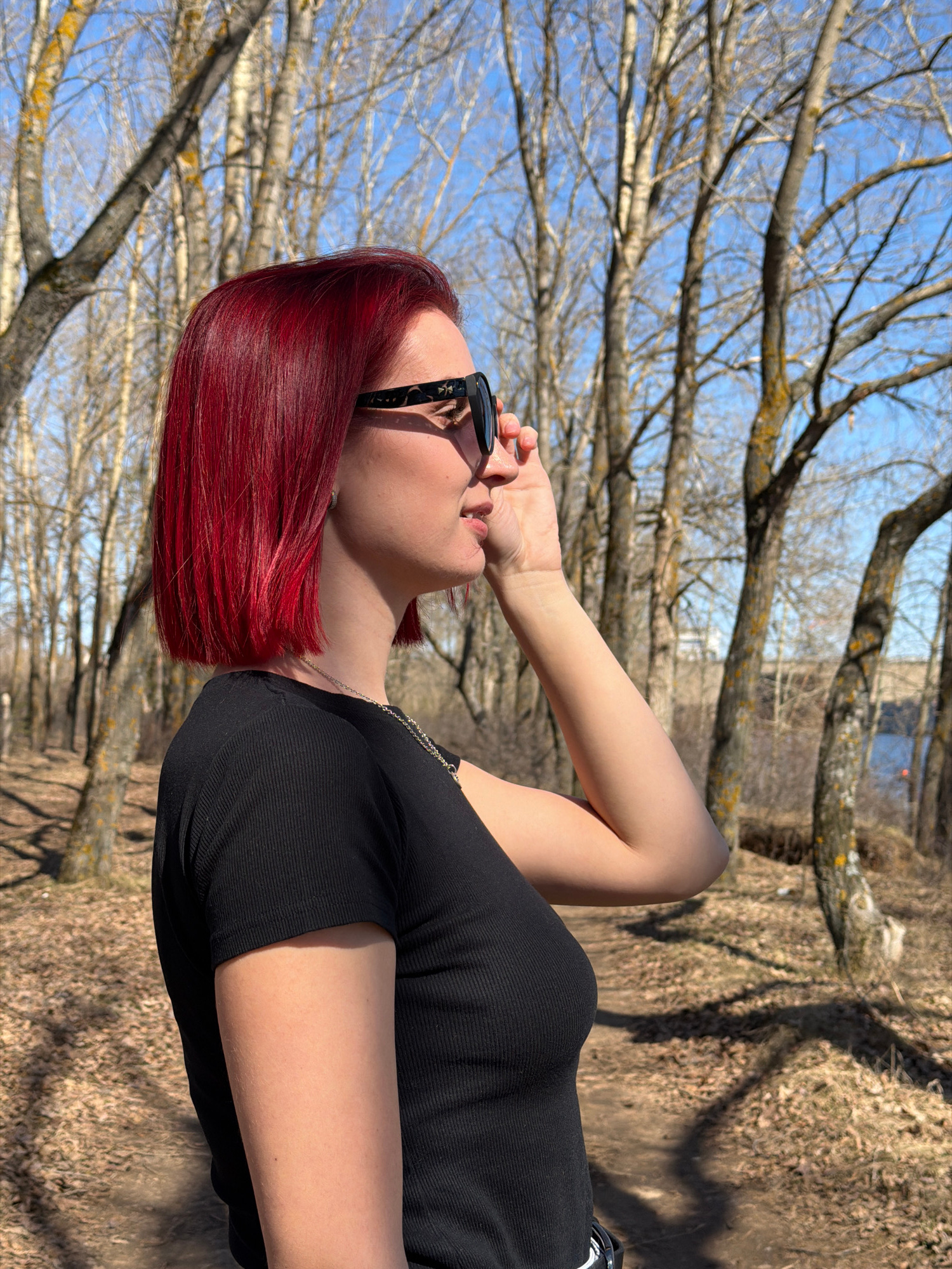 A woman with short, red hair wearing sunglasses and a black top is seen on a path in Chaikovsky, Russia. Her left hand is near her face. The path is lined with leafless trees.