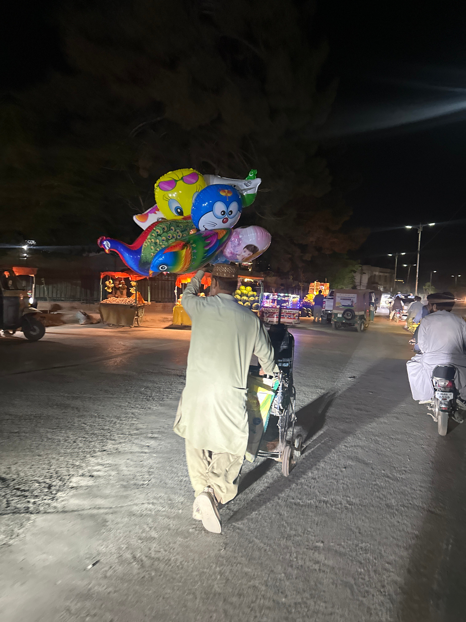 A vendor on a bicycle is positioned on a street in Quetta City Tehsil, Pakistan. He is selling an assortment of colorful character balloons. The street is illuminated by streetlights and traffic. Otheβ¦read more