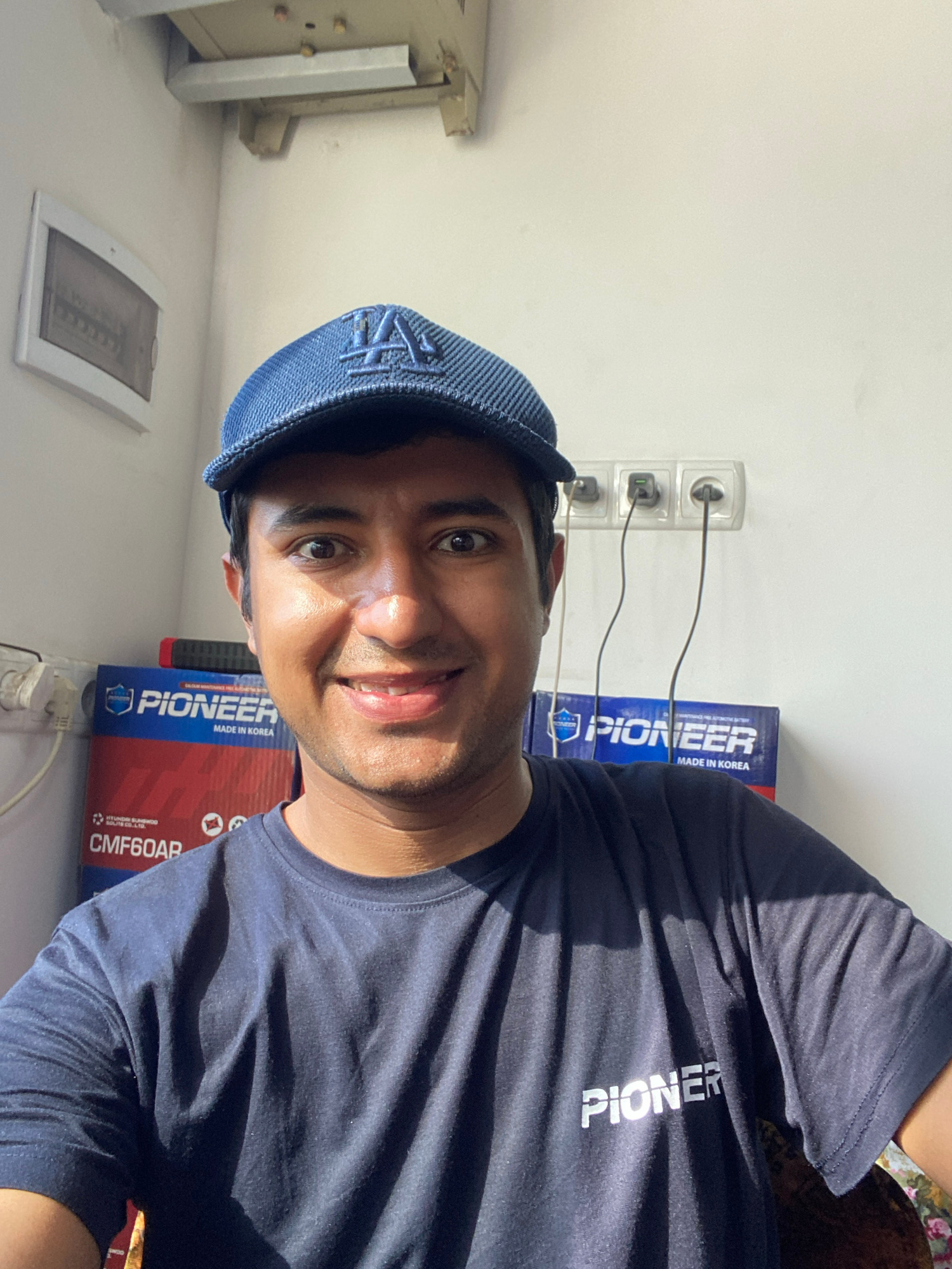 The image is a selfie of a man wearing a blue baseball cap with the letters "LA" embroidered on it. He is wearing a dark blue t-shirt with the word "PIONEER" printed in white on the chest. Behind him…read more