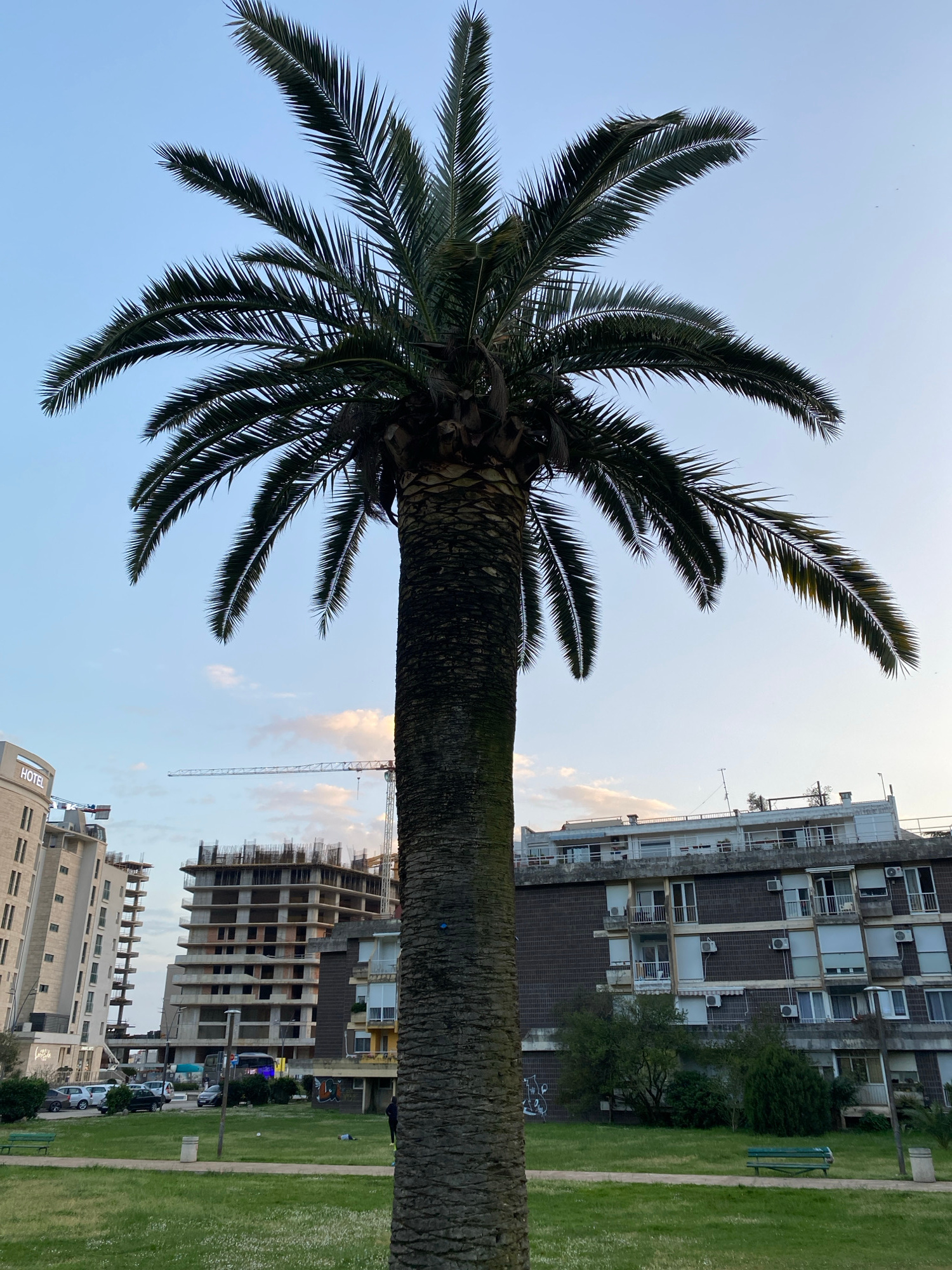 The image shows a tall palm tree with long, dark green fronds against a pale blue sky. The trunk of the palm dominates the center of the frame. In the background, several buildings are visible, incluβ¦read more