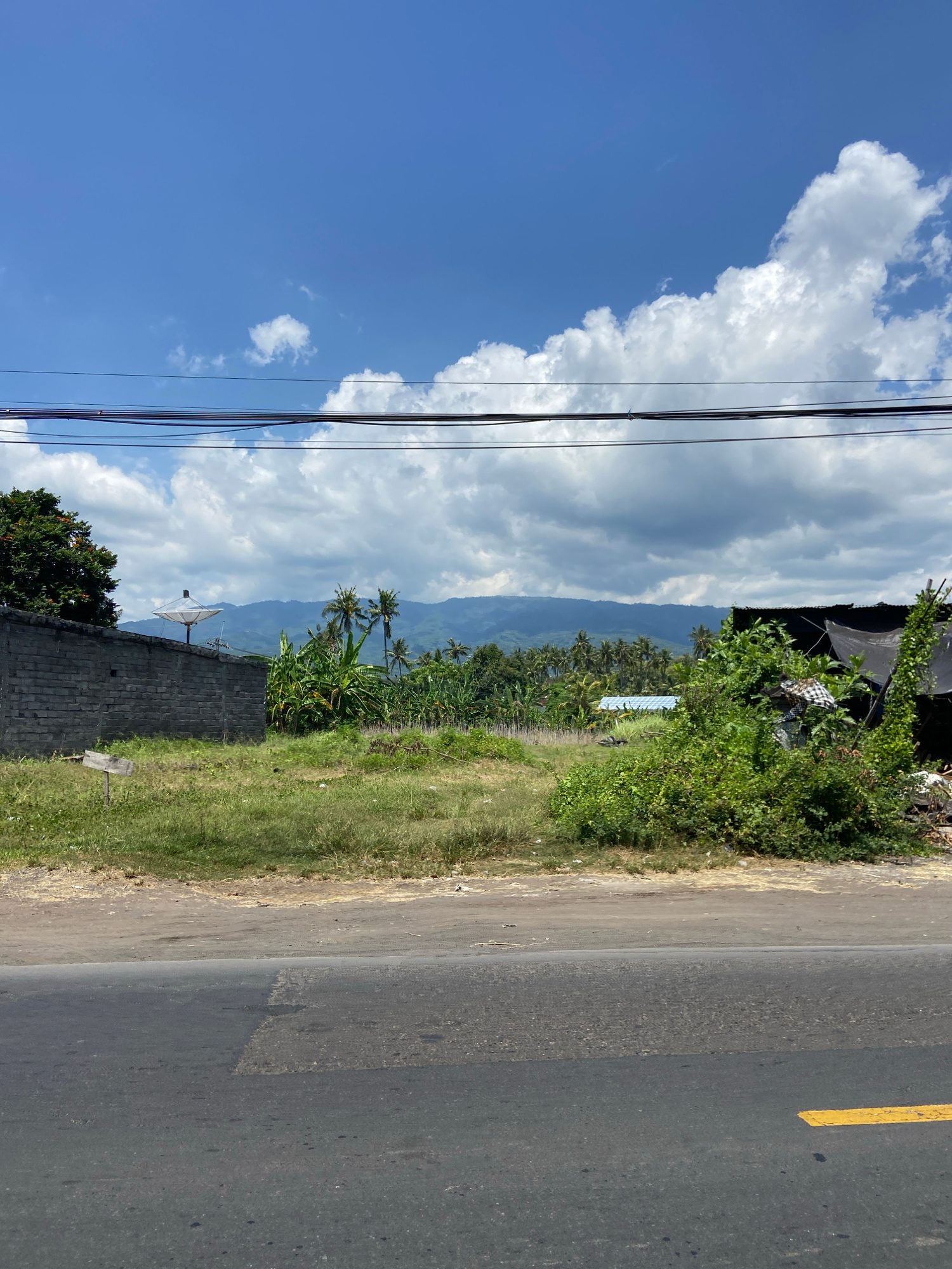 The image shows a rural scene in Buleleng, Indonesia, with a road on the right side. The road is made of asphalt and has a yellow lane marker. To the left of the road is a grassy verge with vegetation…read more