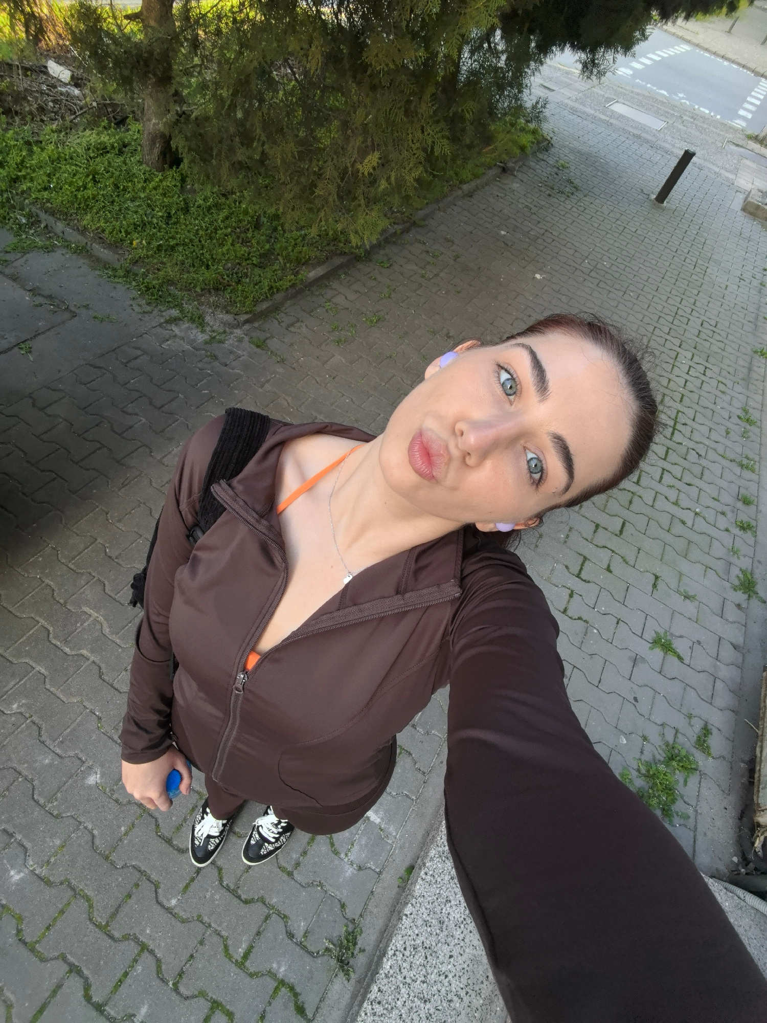 A woman stands on a gray paved street with greenery along its edges. She is wearing a brown zip-up jacket, an orange top visible at the neckline, dark pants, and black-and-white sneakers. She has a ba…read more