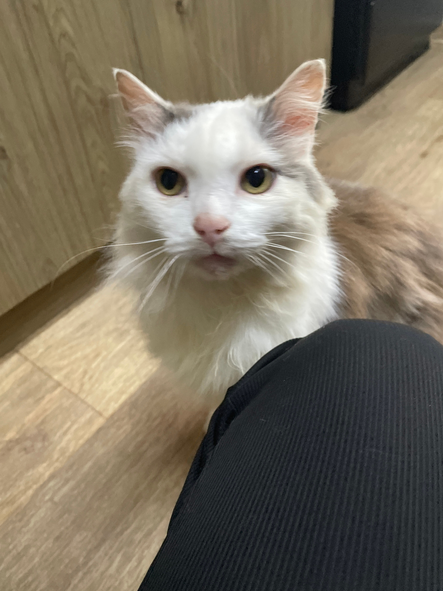 A white and brown domestic cat is the main subject of this indoor photograph, taken in Фоки, Russia. The cat, with prominent white fur, greenish-yellow eyes, a pink nose, and long white whiskers, is l…read more