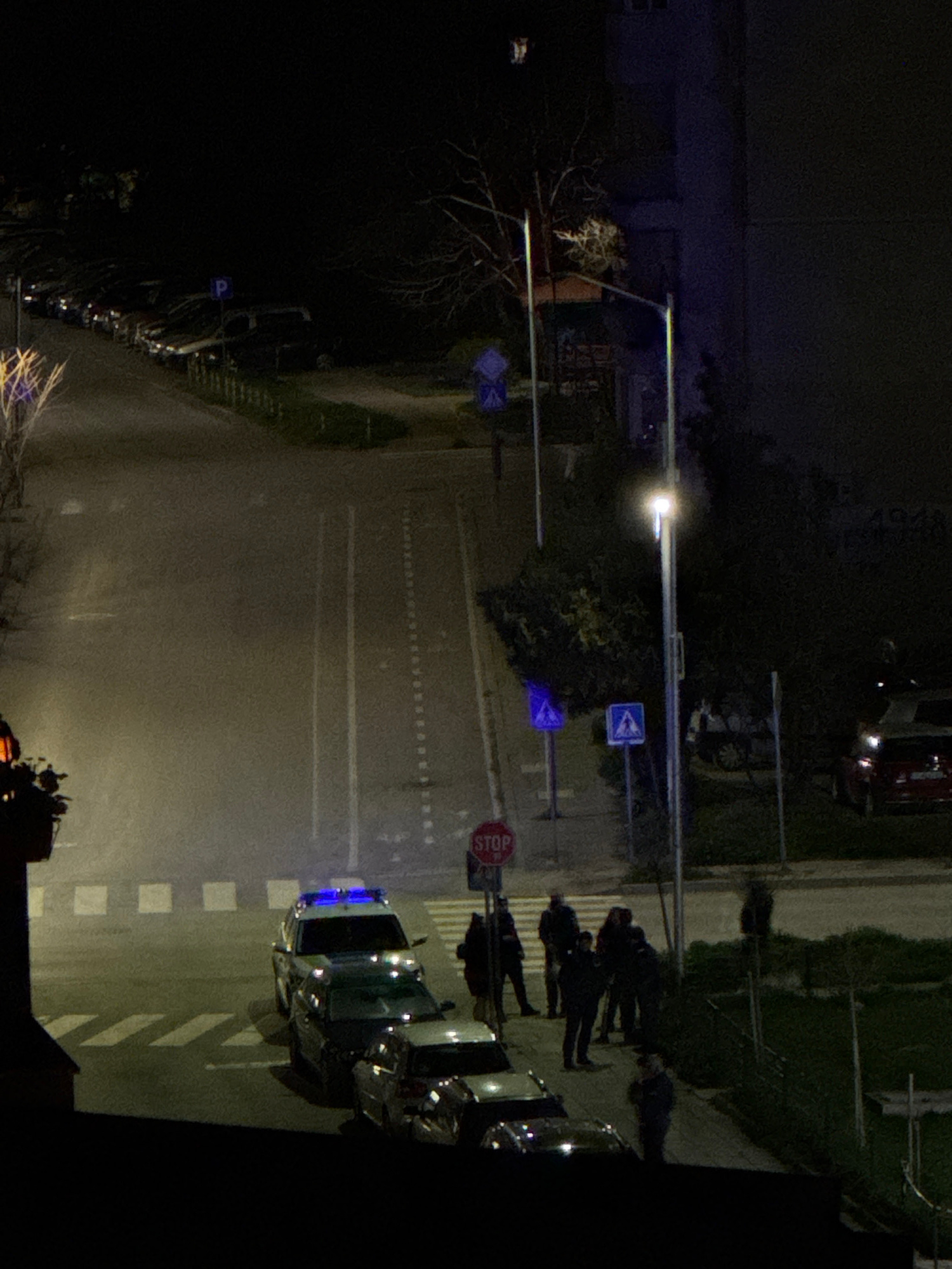 The image depicts a street scene at night in Varna, Bulgaria. A group of people stands near a crosswalk next to a row of parked cars and a police vehicle. Streetlights illuminate a road with white lan…read more