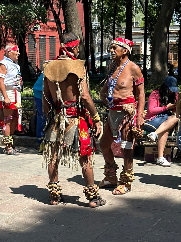 The image depicts an outdoor scene in a public square within the historic center of Mexico City, Mexico, likely near Plaza de Santo Domingo or Alameda Central. Three adult males are visible in the foreground, dressed in traditional indigenous attire under bright daylight. The central figure, viewed from behind, is a man with a muscular build, dark skin, wearing a red bandana, a tan leather vest with a fringed hem and raw leather ties, and a red loincloth adorned with white and red fabric accents. A red sash with a yellow spiral design is tied around his waist, and he has a yellow band on his left wrist. His lower legs are bare, and he wears dark sandals with large, light-colored seed or pod rattles secured around his ankles. To the right of the central figure, an older man with dark skin and a mustache is seen in profile, facing left. He is shirtless, wearing a red bandana with white patterns, a prominent blue and white beaded necklace with a central pendant, and red fabric armbands on both biceps. He wears a red loincloth over a white undergarment, secured by a decorative brown pouch or belt. Similar seed rattles are affixed to his ankles above dark sandals. He holds a cluster of these rattles in his left hand. To the left, a third older man is partially visible in profile, facing right. He wears a red bandana, a white sleeveless tunic with dark designs, and a red and white skirt-like garment. His bare arms include a white band on the right bicep. He also wears sandals with prominent seed rattles around his ankles and holds a small white, cylindrical object. The central and right figures appear to be engaged in a direct interaction, facing each other. In the background, a person in a blue shirt is partially visible to the left. To the far right, a woman with long dark hair, wearing a pink long-sleeved top, blue jeans, and a blue baseball cap, sits on a bench or low wall, looking down at a handheld device. A brown box is visible near her feet. The ground is paved with light-colored, interlocking tiles, indicating an urban public space. Tall trees with dark trunks and dense green foliage frame the background. A red building is visible behind the left figures, and a lighter-colored building with archways or columns stands further back on the right. Strong sunlight from the upper right casts distinct shadows across the paved surface. | Open Wire