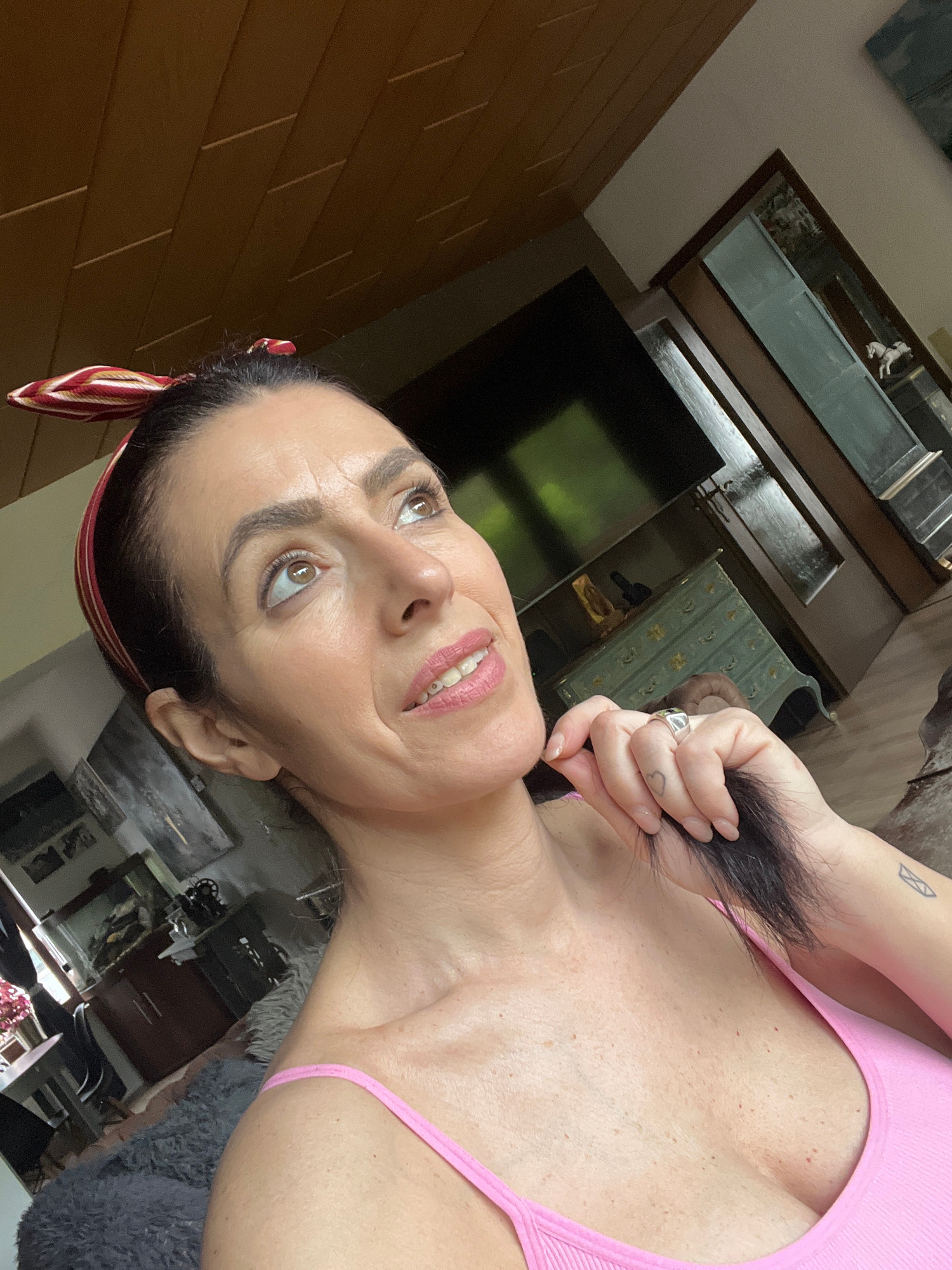 A woman with dark hair and fair skin is seen from a low, angled perspective. She wears a pink top and a striped headband. She is holding a lock of her dark hair in her hand, which features a silver ri…read more