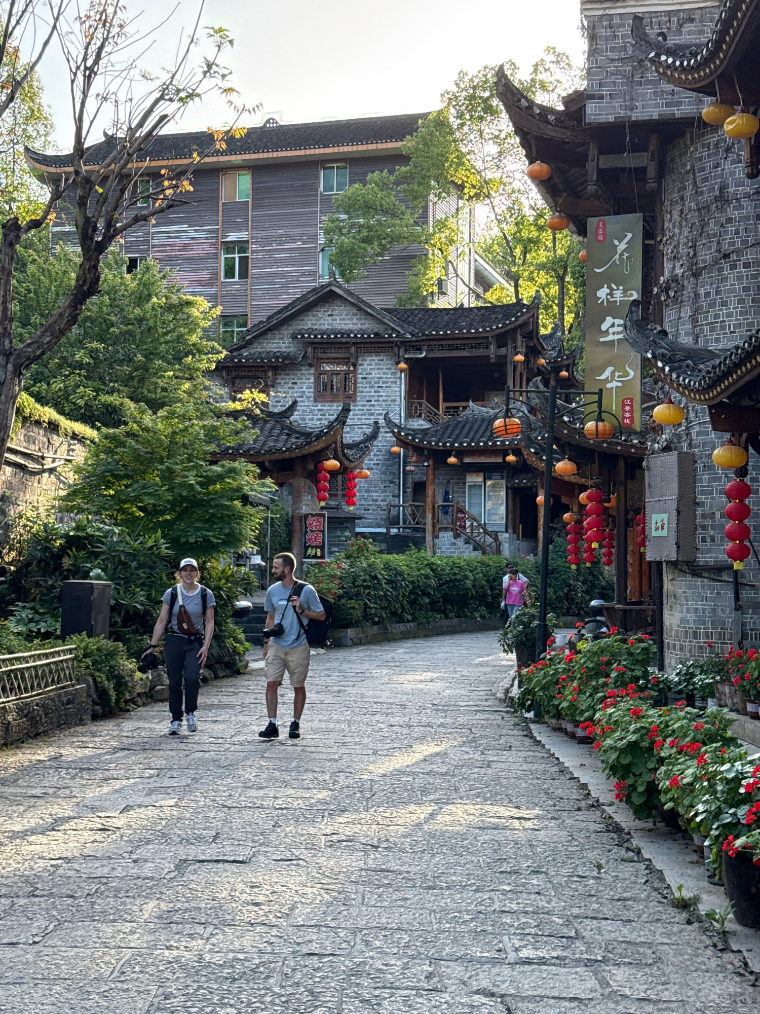 The image shows a narrow, cobblestone street in Furong, China. Traditional Chinese architecture lines both sides of the street, with multi-tiered buildings, ornate roofs, and red lanterns. Two men are…read more