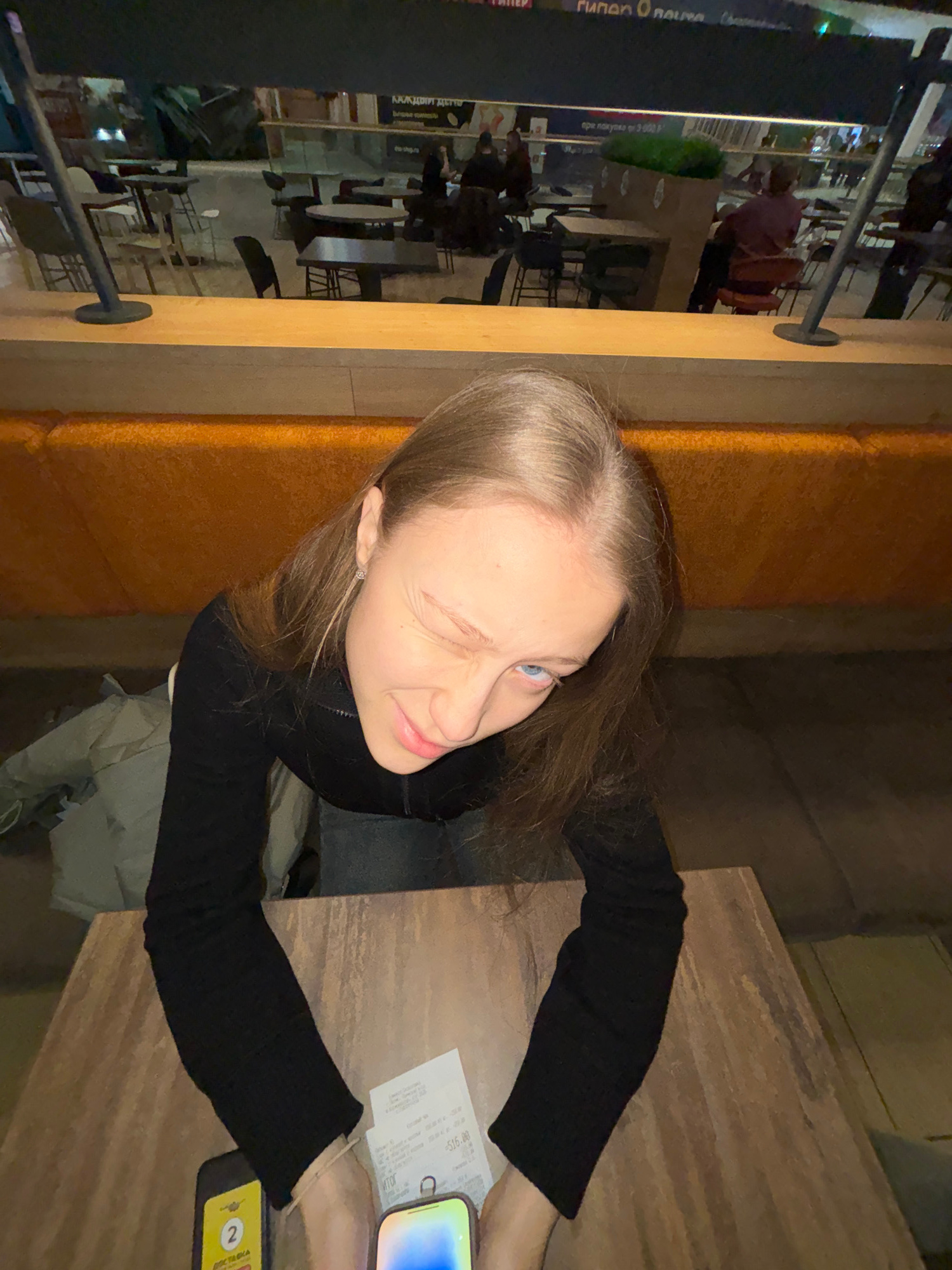 A young woman with long brown hair and blue eyes is sitting at a wooden table in a restaurant and winking at the camera. She is wearing a black long-sleeved shirt and jeans. A beige-colored jacket is…read more