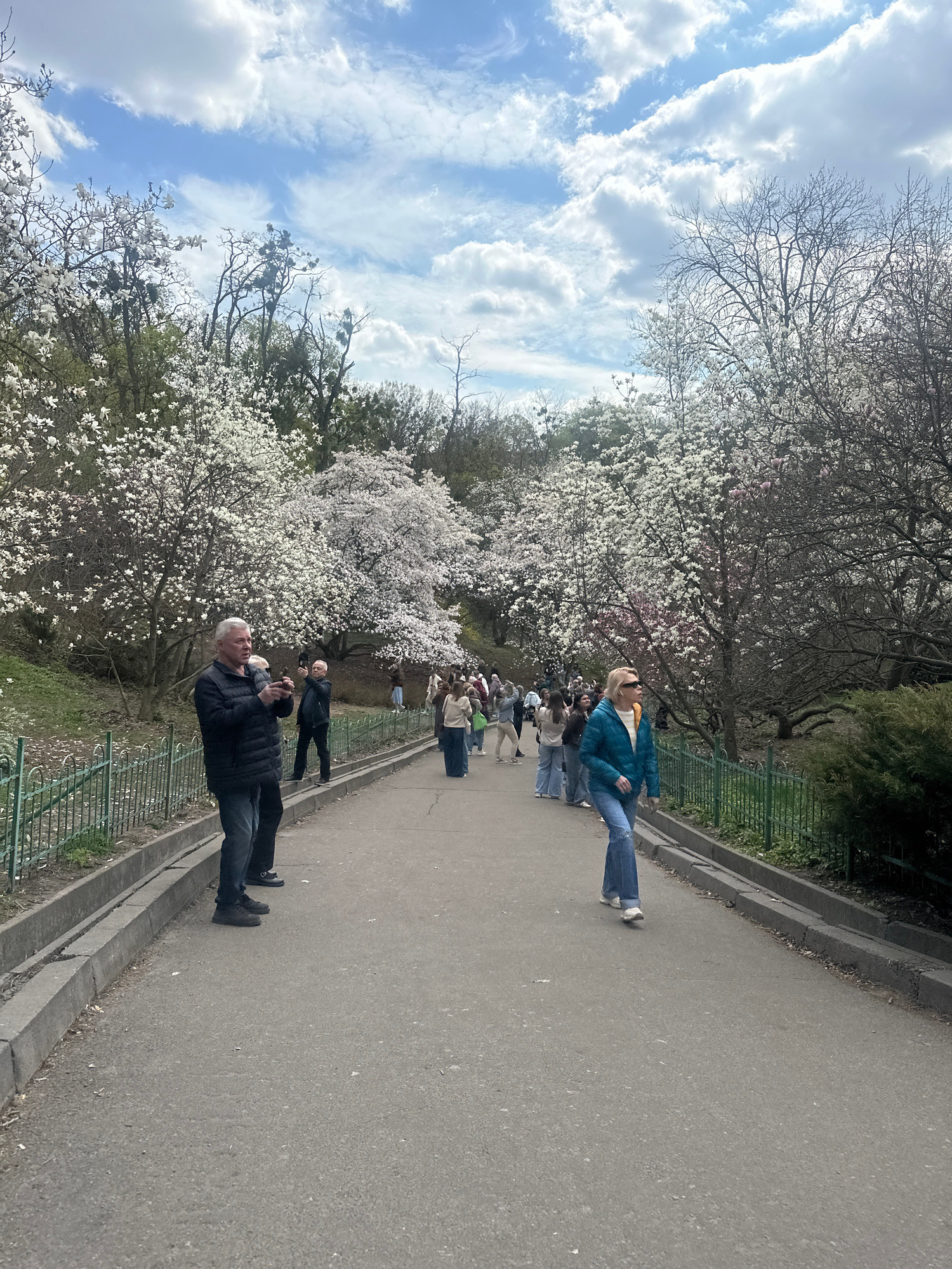 The image, correctly oriented, depicts a lively spring scene in a park or botanical garden on a bright, partly cloudy day. A paved asphalt pathway, bordered by a low green metal fence and a concrete c…read more