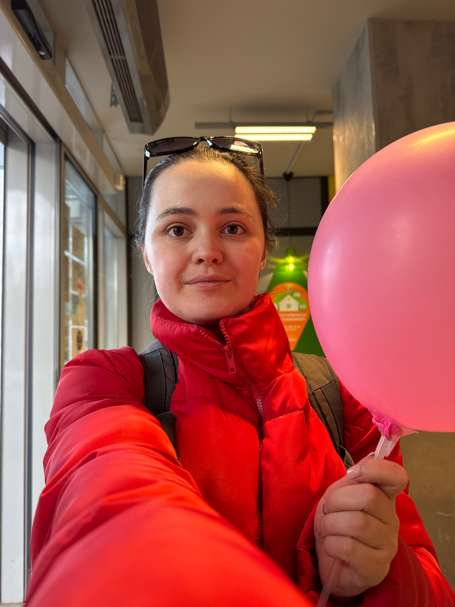 A woman wearing a red puffer jacket and sunglasses on her head is holding a pink balloon. She is standing inside a building with glass doors and windows. The location is Izhevsk, Russia. There is an a…read more